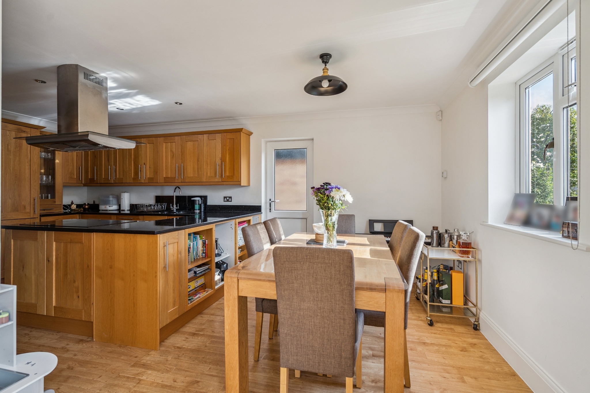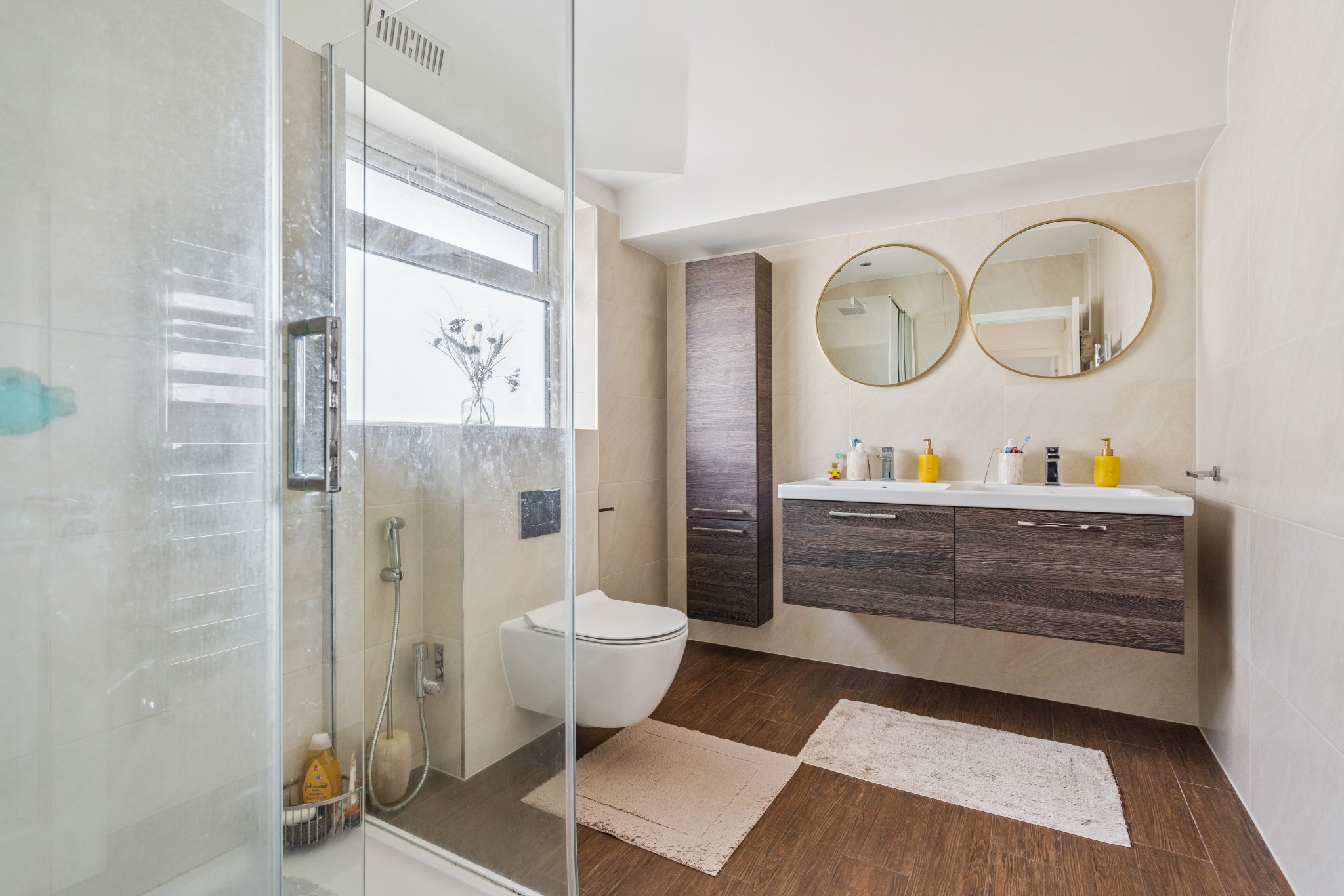 Upstairs, the first floor comprises three bedrooms, two of which benefit from fitted wardrobes, and a sleek, modern family bathroom complete with his and hers sinks.