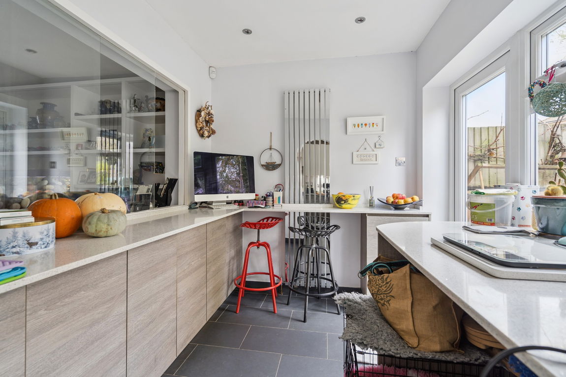 The ground floor welcomes you with a bright and spacious reception room featuring a large bay window that floods the space with natural light. This flows seamlessly into a stylish dining area complete with modern fitted storage, creating an ideal setting for both relaxing and entertaining. The rear aspect kitchen is fitted with sleek, modern units and integrated appliances, with a French door opening onto the rear garden. A separate utility room provides additional practicality, with direct access to a snug, gym area and a useful store room.