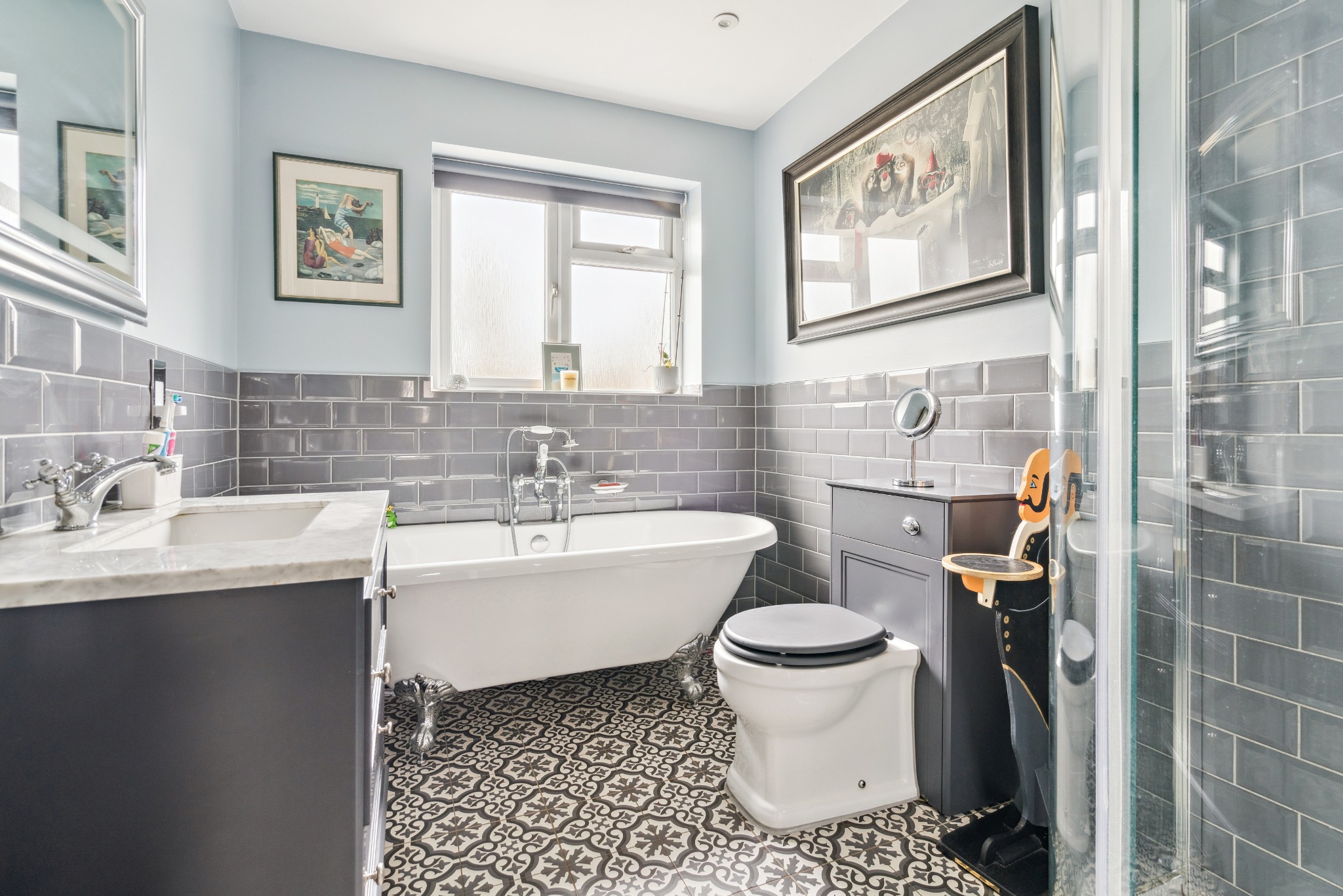 Upstairs, the generous principal bedroom boasts a large bay window and fitted wardrobes. Three additional bedrooms, two with fitted wardrobes, provide ample space, while the contemporary family bathroom features a roll-top bath, a separate shower, and under-sink storage.