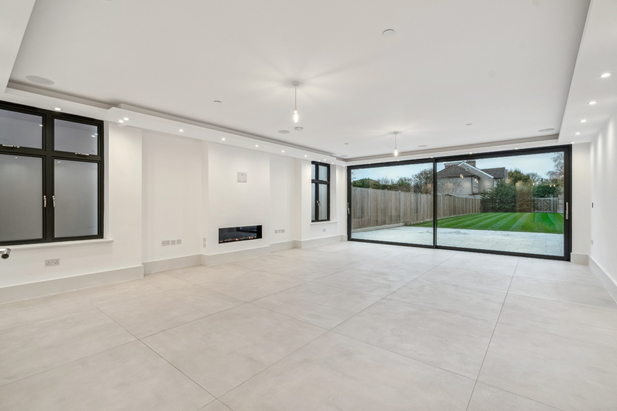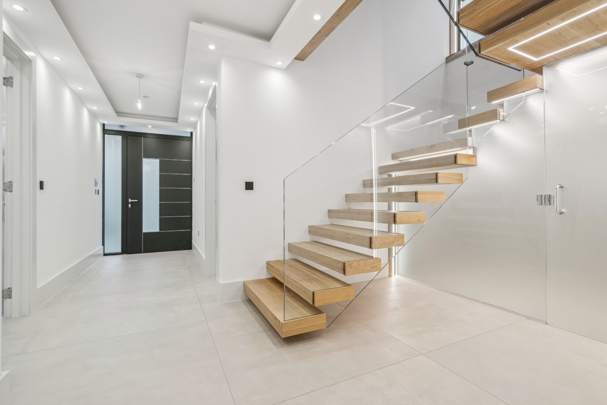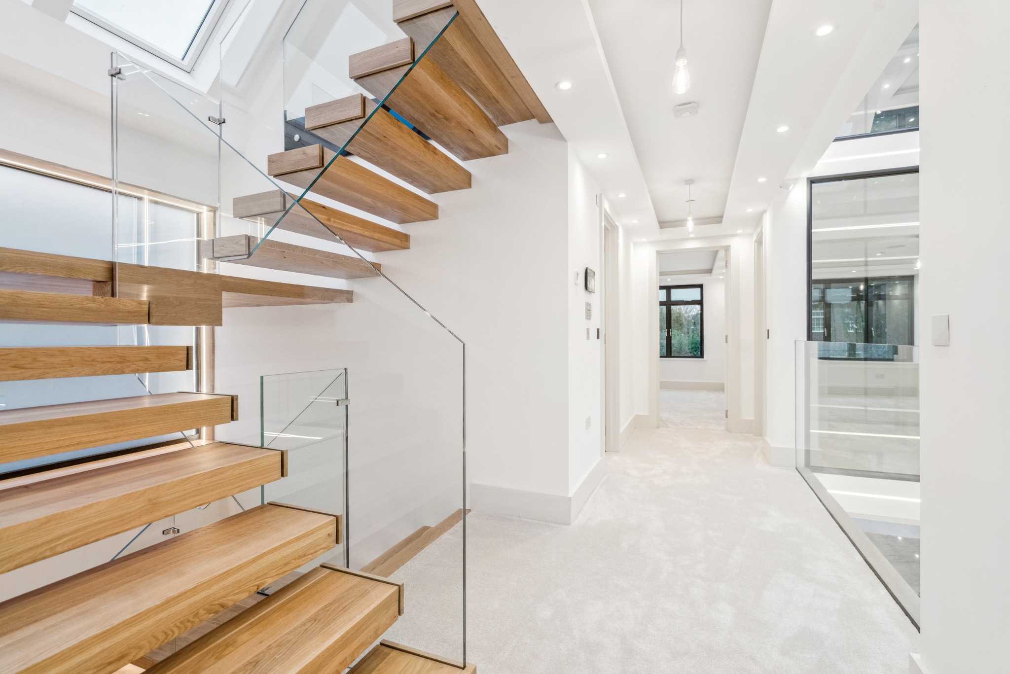 Throughout the house there are Sonos speakers, 4-Lights System, floor-to-ceiling doors, floating Prime Oak stairs with glass balustrades, Schuco aluminium windows and doors, and Air Conditioning Ducting throughout. Further benefits include control alarm panels, Rako Lighting System Hub, commercial level Water softener, x2 Mega Flows, x2 Valiant boilers with Magna clean, CCTV, Gas fireplace, wet underfloor heating, heated towel rails to all bathrooms, an electrical garage door, and x2 garage and x2 external EV charging points.