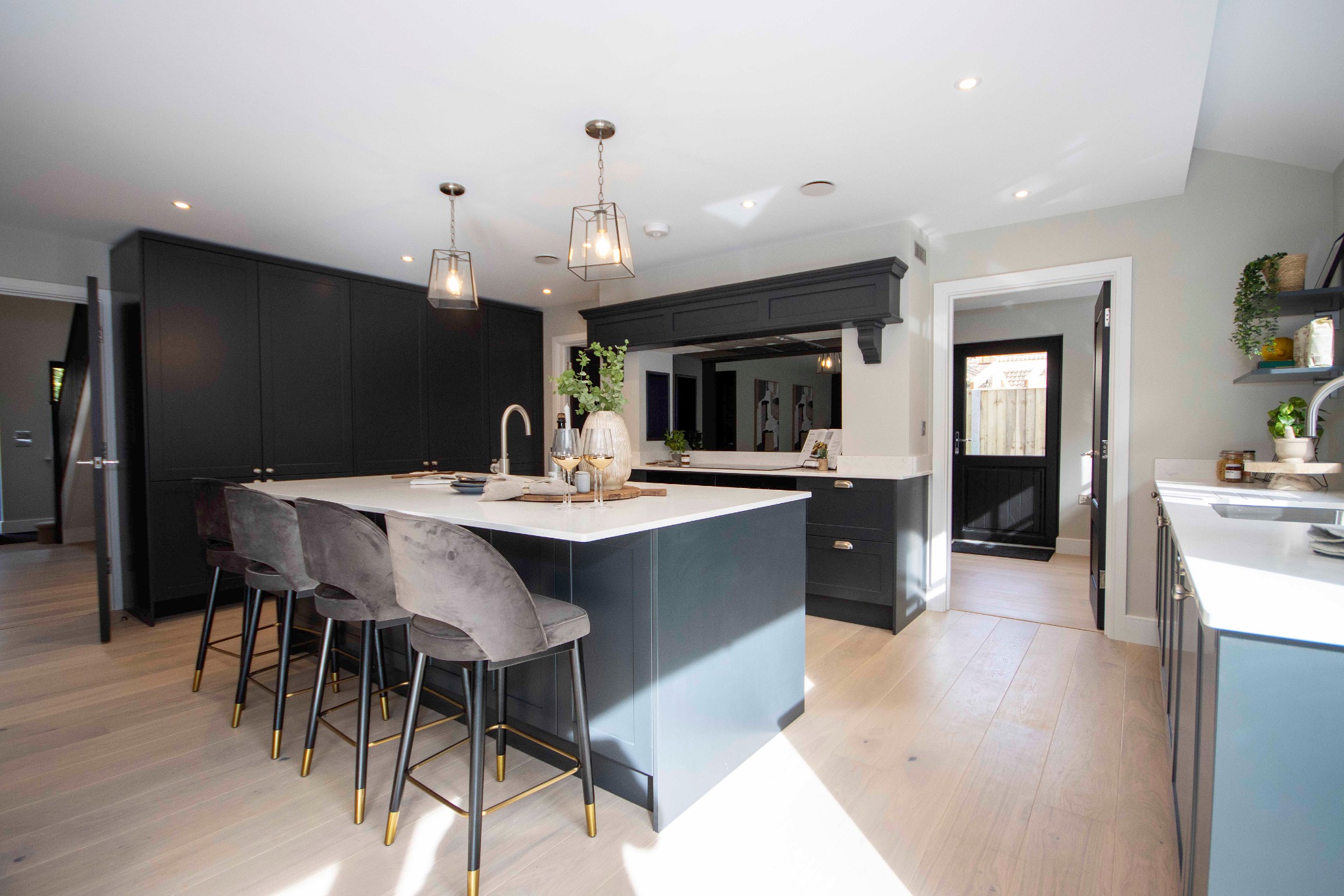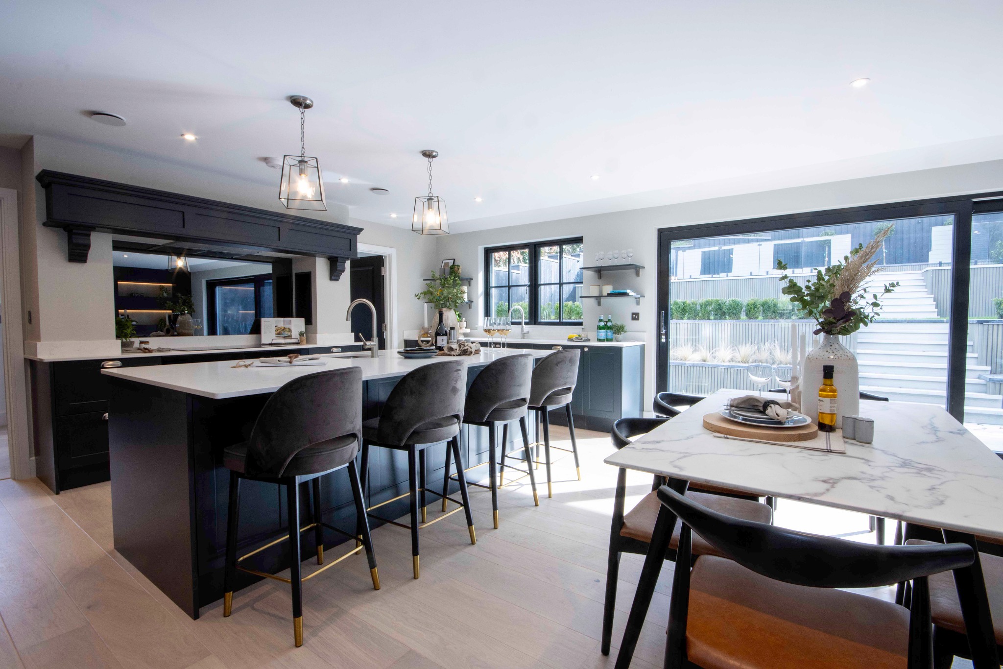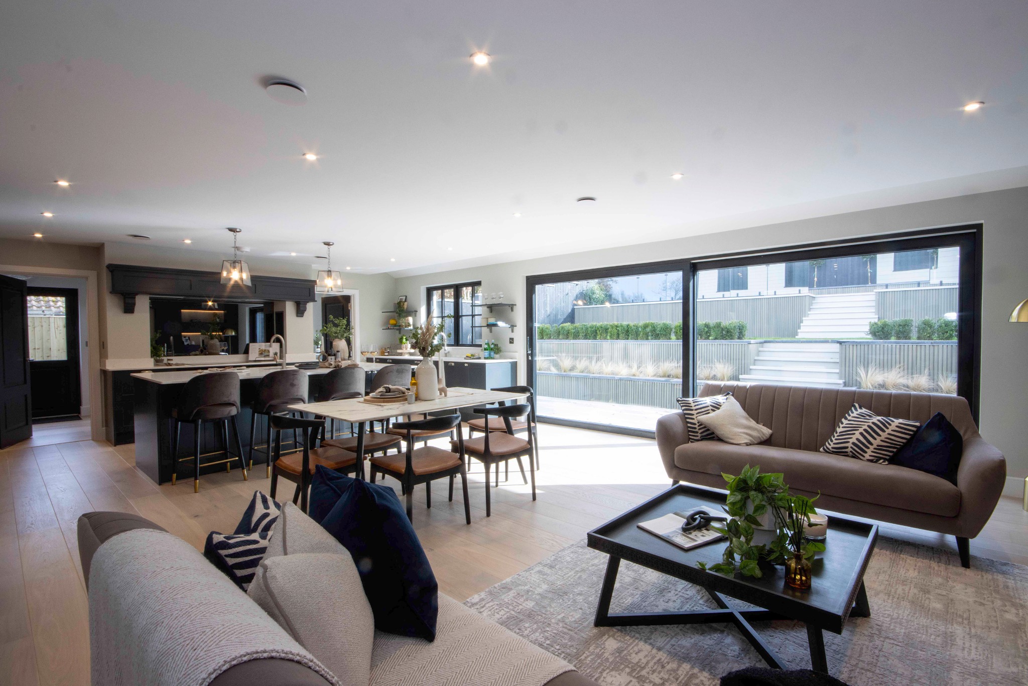 There is a welcoming reception hall leading to an open-plan family dining and kitchen area perfect for entertaining and is sure to become the heart of the home with triple-glazed sliding doors opening to a decked area and garden. The living area is flooded with natural light and boasts an eye-catching media feature, with access to a utility area and a service room, both with doors opening outside.