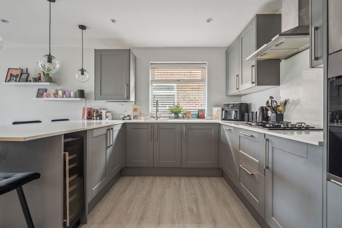 The modern kitchen is thoughtfully designed with a good range of fitted units, integrated appliances, and a generous breakfast bar area, perfect for both everyday dining and entertaining.