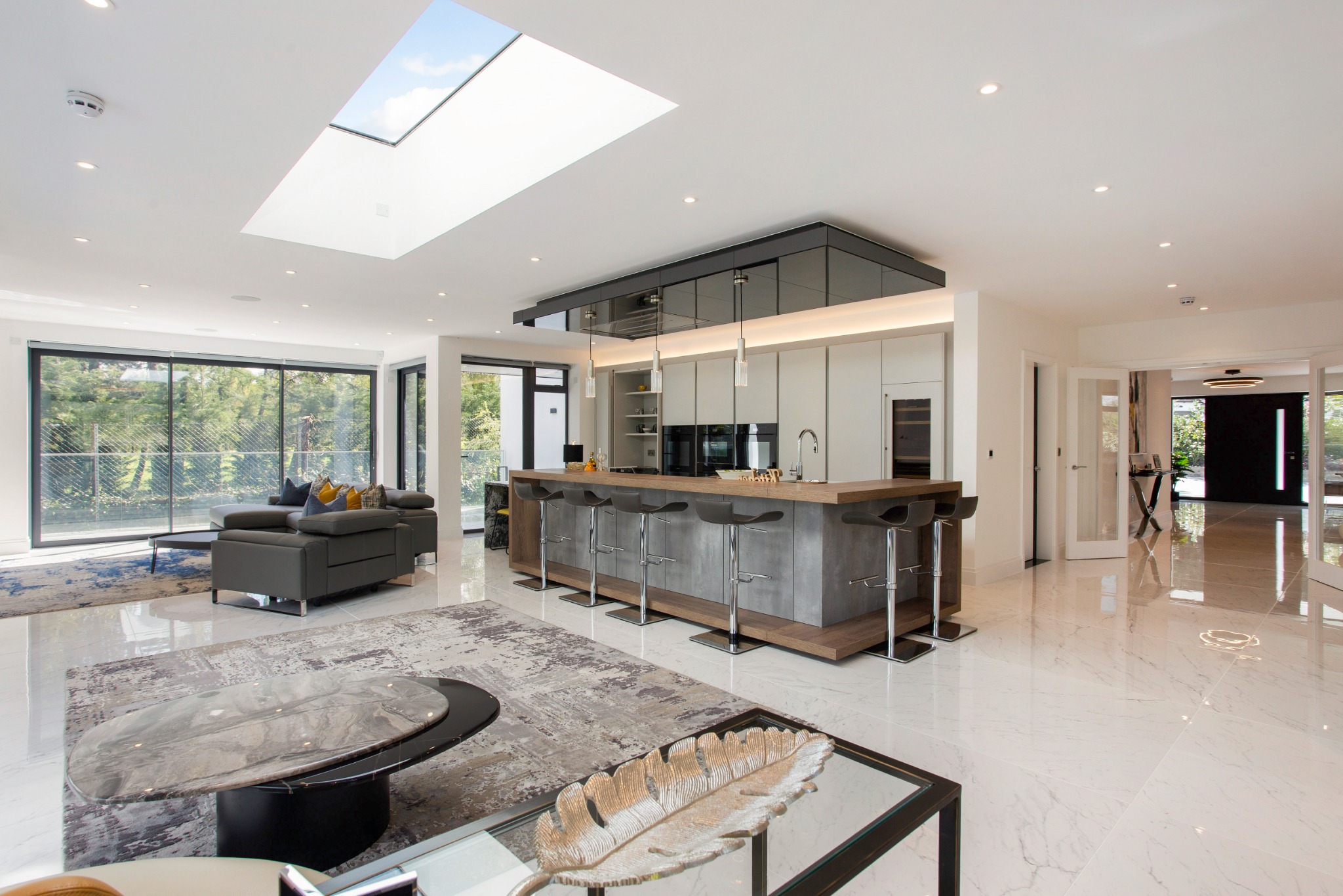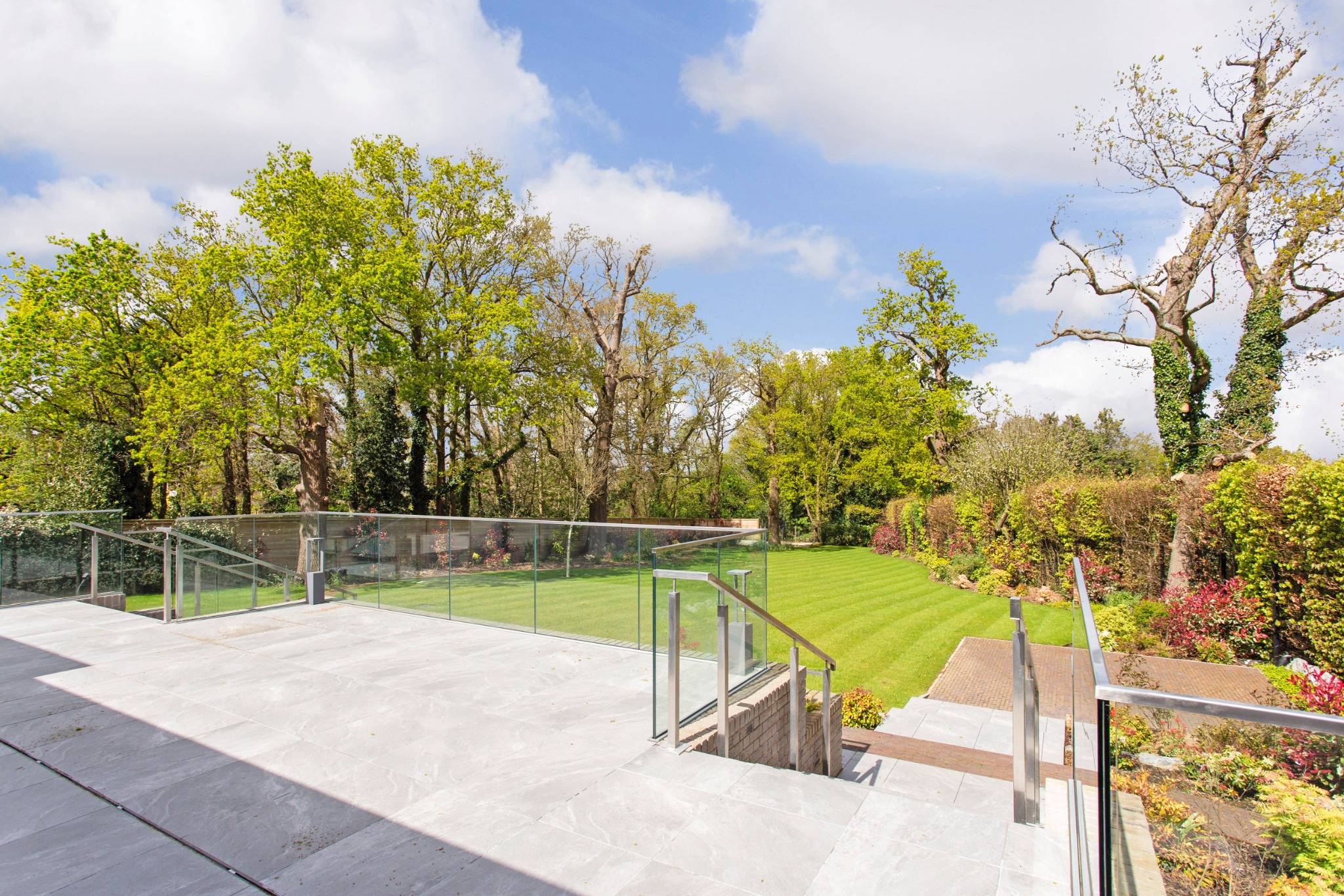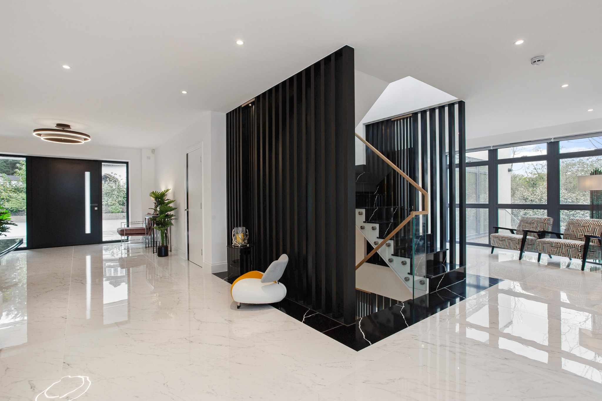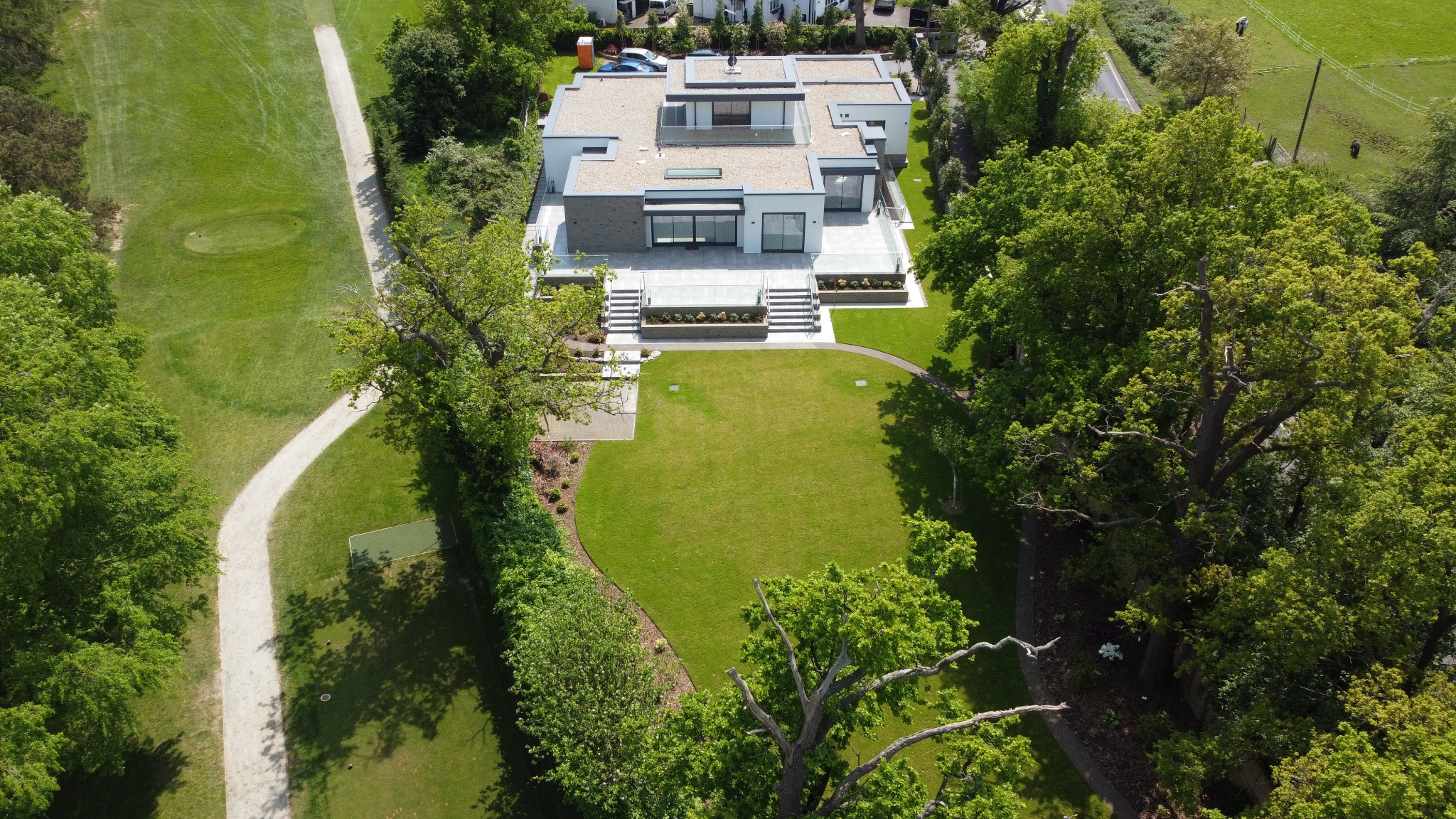 A stunning example of modern contemporary architecture, this newly constructed 5 bedroom, 5 bathroom detached residence, offers spacious light filled accommodation over three well-appointed levels with panoramic views over Moor Park golf course and surrounding countryside. The extensive ground floor accommodation comprises a spacious entrance hall with guest cloakroom and bespoke marble and glass staircase. Double doors lead through to a living room with marble fireplace surround, continuing through to a large open plan kitchen/dining/living area with sliding doors to the outside terrace. The stylish kitchen, created by German designers, Leicht, features an island/breakfast bar finished with marble worktops and natural solid wood edging, integrated Miele appliances and a range of full height handleless units. Accessed from the main entrance hall, double doors open through to a principal bedroom suite with walk-in dressing room and luxurious ensuite bathroom with double rain shower enclosure, his & hers basins, wc, freestanding bath tub and inset TV and speakers.