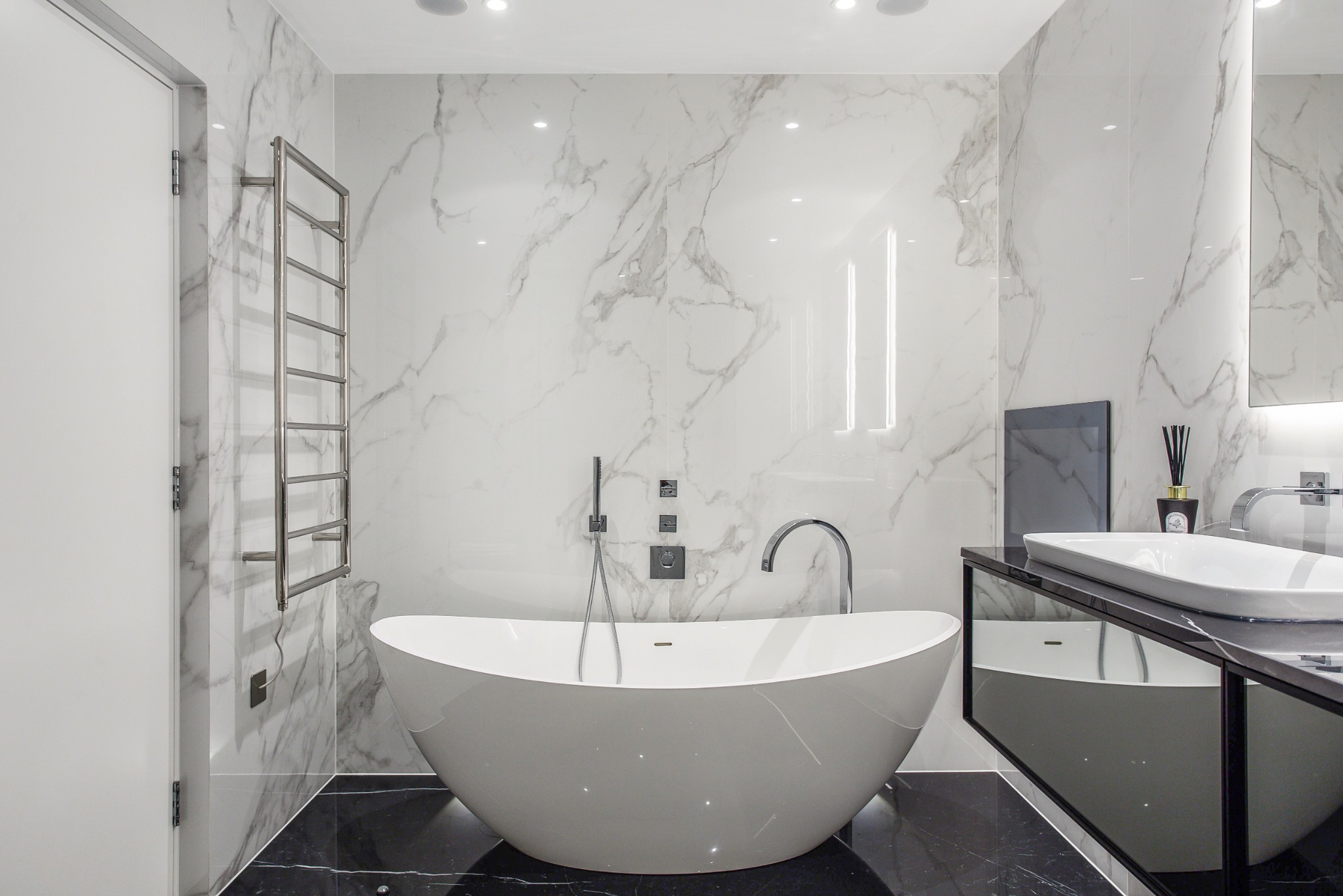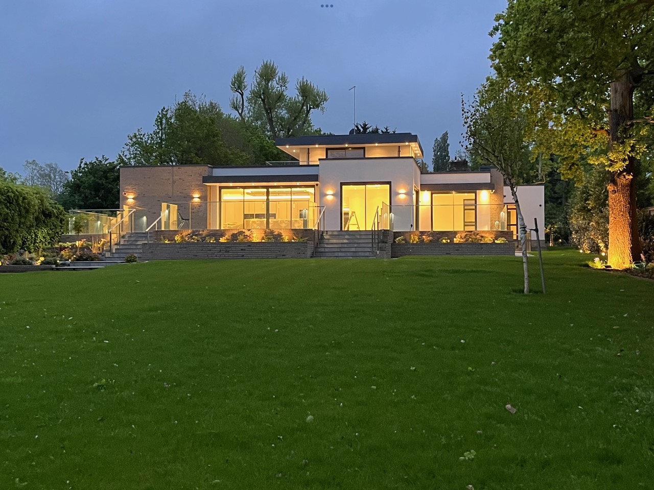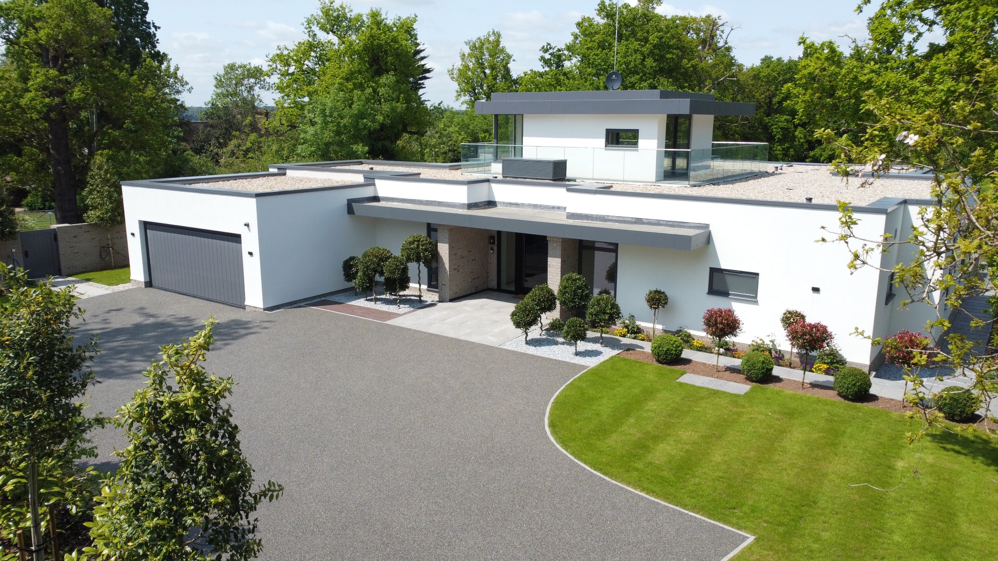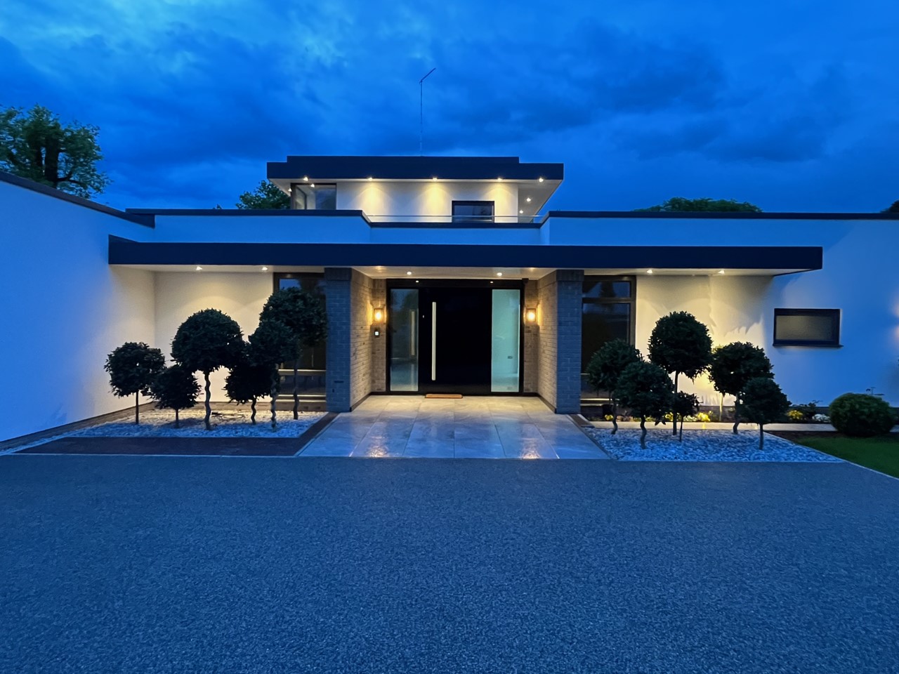 A stunning example of modern contemporary architecture, this newly constructed 5 bedroom, 5 bathroom detached residence, offers spacious light filled accommodation over three well-appointed levels with panoramic views over Moor Park golf course and surrounding countryside. The extensive ground floor accommodation comprises a spacious entrance hall with guest cloakroom and bespoke marble and glass staircase. Double doors lead through to a living room with marble fireplace surround, continuing through to a large open plan kitchen/dining/living area with sliding doors to the outside terrace. The stylish kitchen, created by German designers, Leicht, features an island/breakfast bar finished with marble worktops and natural solid wood edging, integrated Miele appliances and a range of full height handleless units. Accessed from the main entrance hall, double doors open through to a principal bedroom suite with walk-in dressing room and luxurious ensuite bathroom with double rain shower enclosure, his & hers basins, wc, freestanding bath tub and inset TV and speakers.