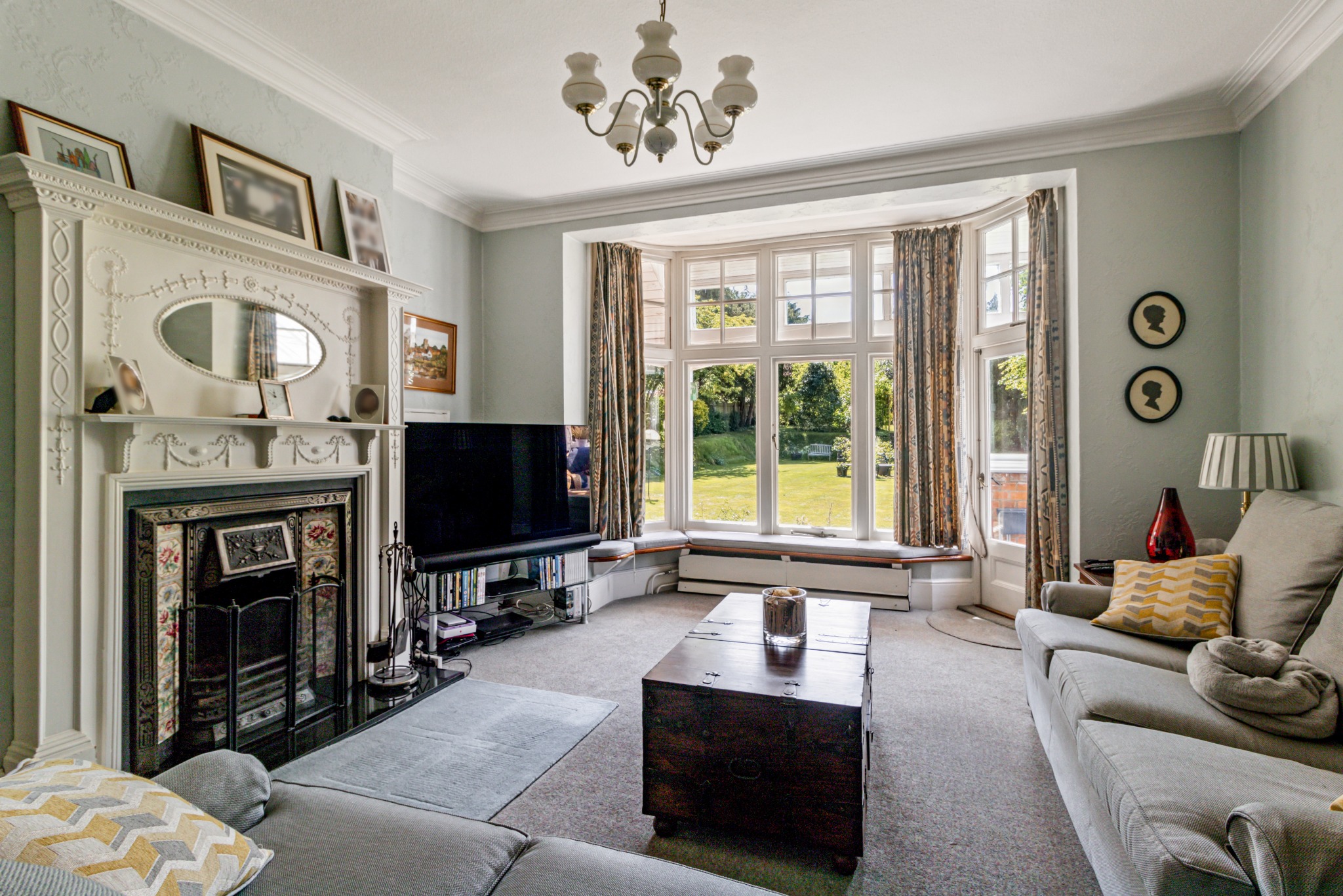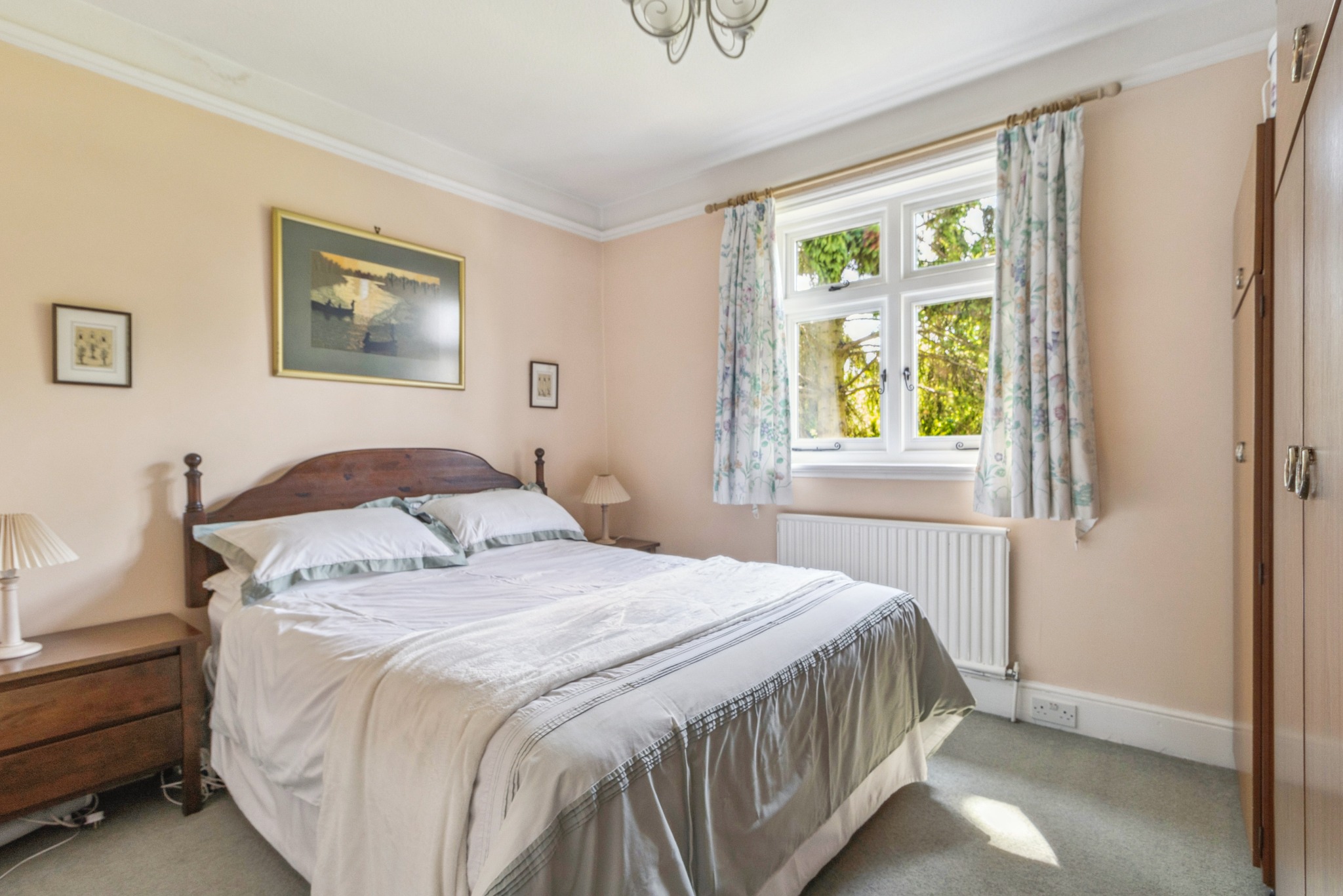 The private rear garden is laid mainly to lawn with mature trees, established shrubs, and a loggia. Steps to the rear of the garden take you to an Orchard. To the front, a driveway provides off-street parking, along with two garages.