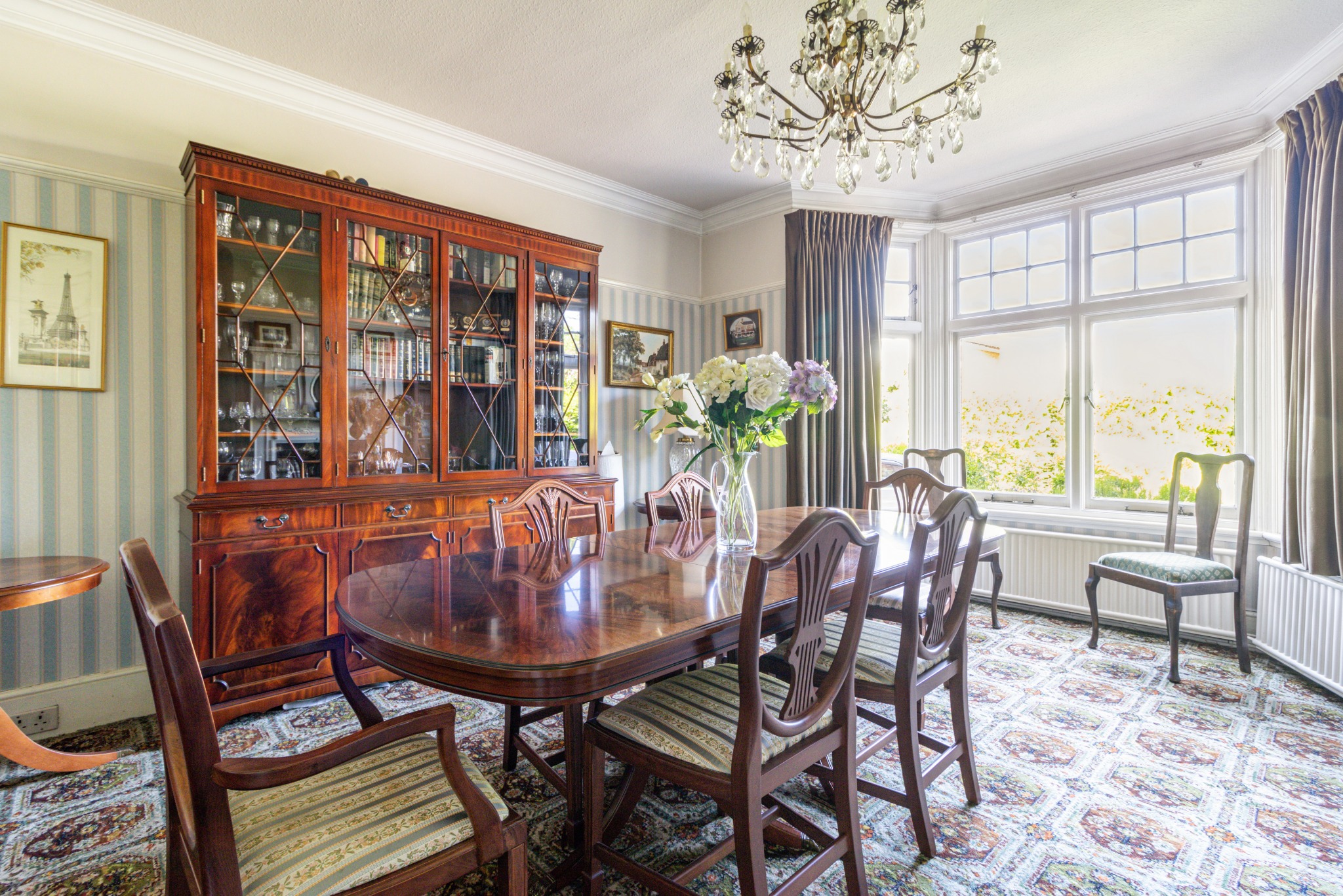 A welcoming porch opens into a bright entrance hallway, with stairs leading down to a versatile basement level featuring two workshops, ideal for hobbies or additional storage. The ground floor offers a wealth of space, beginning with a front-aspect dining room flooded with natural light from a large bay sash window, complemented by a feature fireplace.