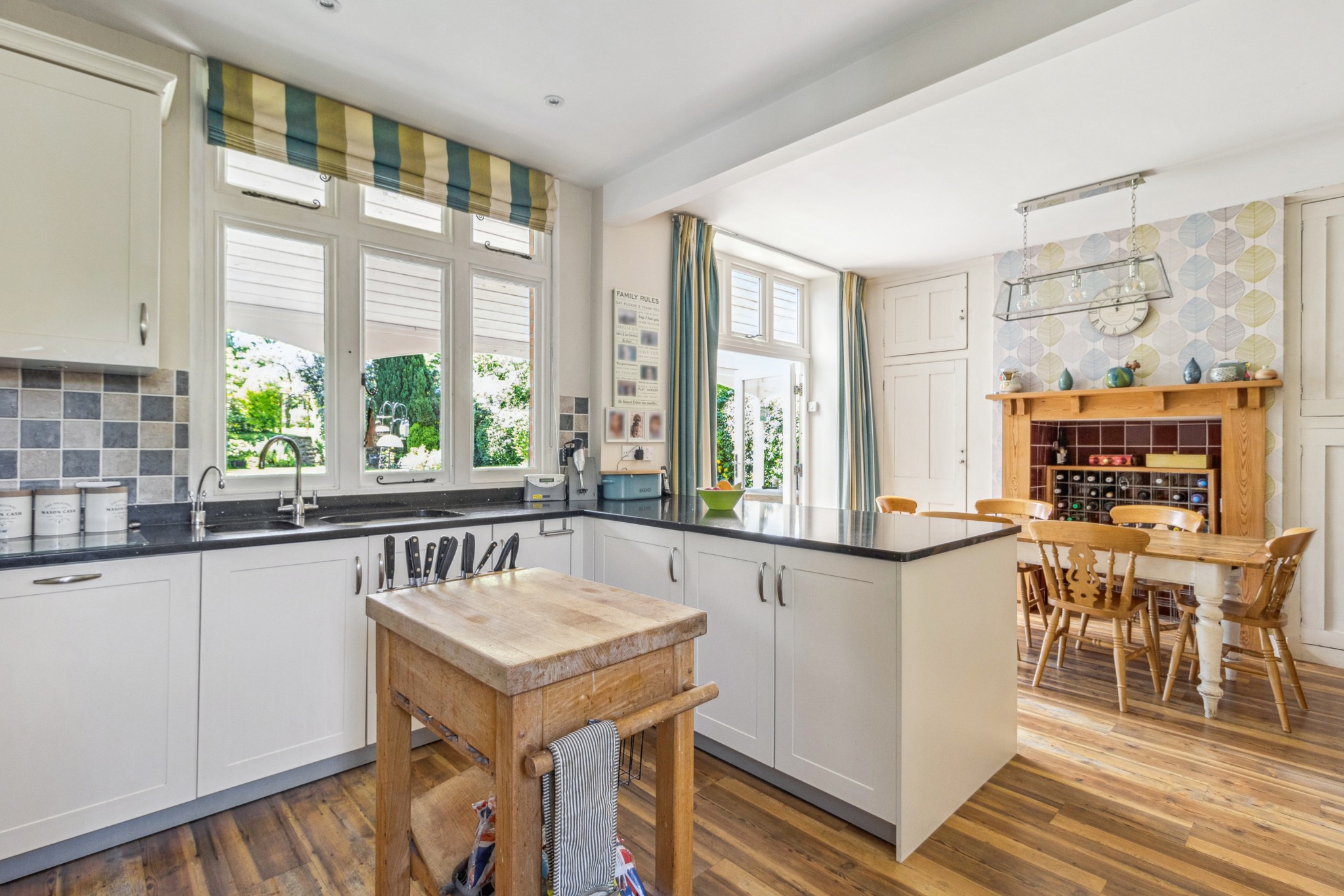 The well-appointed kitchen/breakfast room boasts a range of fitted units, integrated appliances, and ample space for a dining table and chairs. French doors lead directly out to the garden, perfect for family meals or entertaining. Adjacent is a living room with another elegant feature fireplace and French doors opening into a conservatory, which in turn opens out to the rear garden.