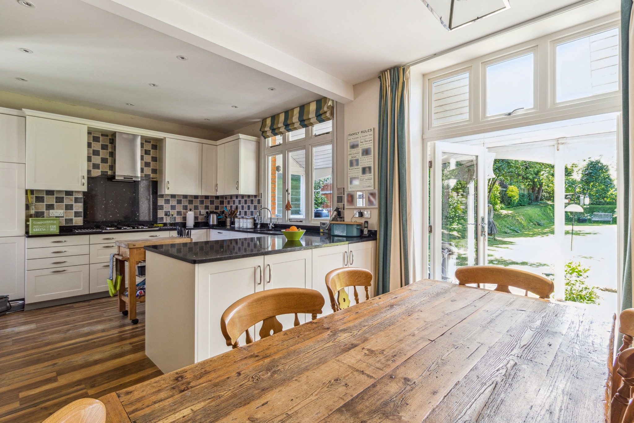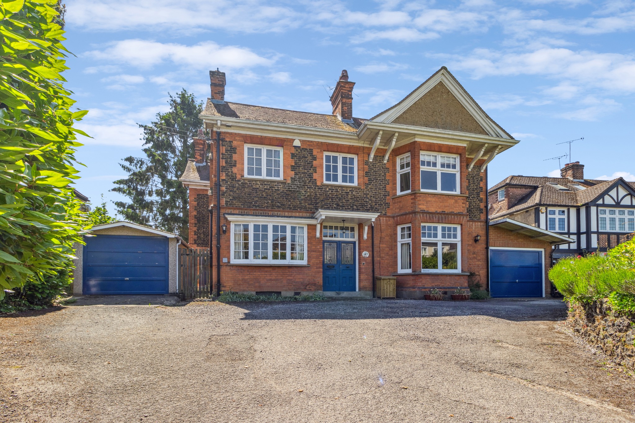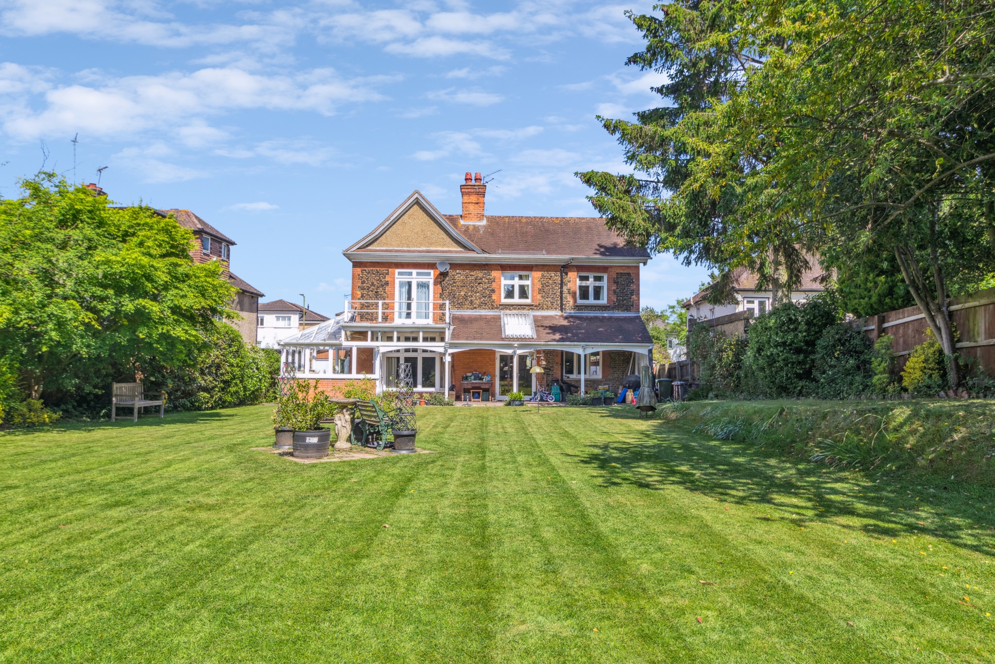 Upstairs, the principal bedroom benefits from an en-suite shower room and French doors opening onto a private balcony overlooking the garden. There are four additional double bedrooms, one of which also includes an en-suite, plus a family bathroom.