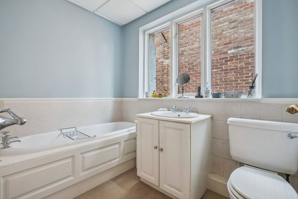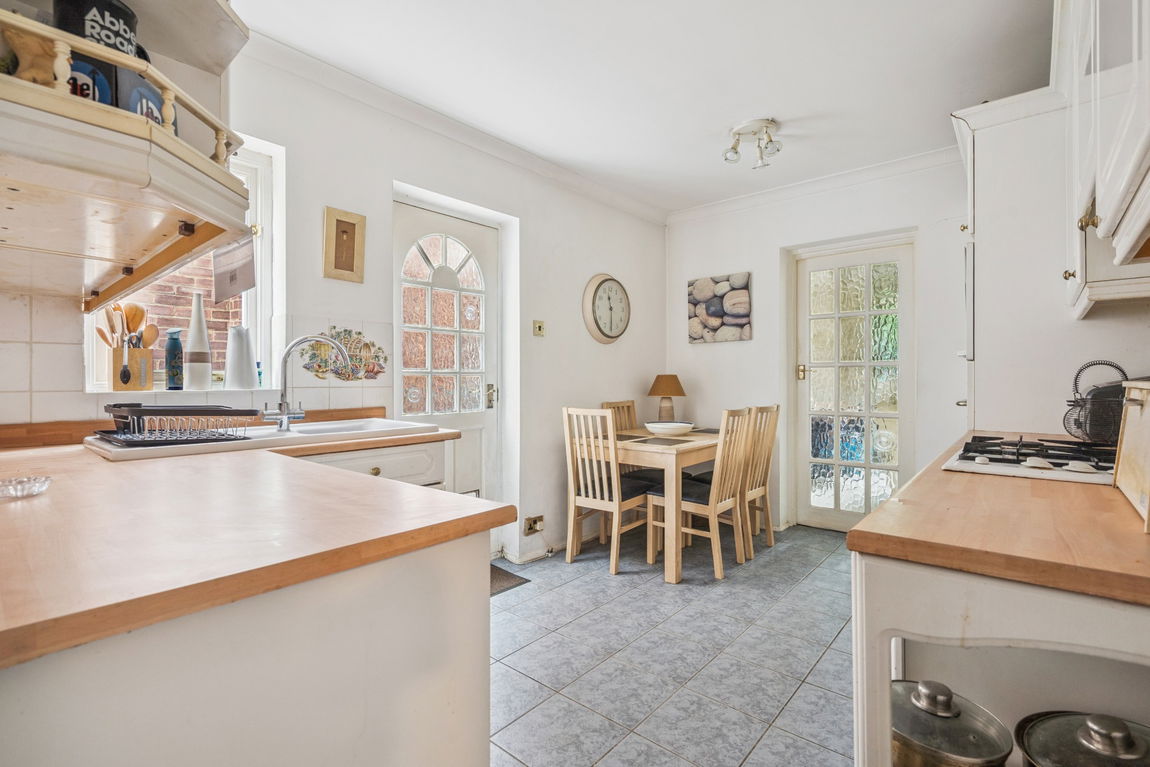 The kitchen, which can be accessed from both the family room and the hallway, offers a good selection of fitted units and integrated appliances, along with space for a small kitchen table and chairs. A French door provides access to the garden.