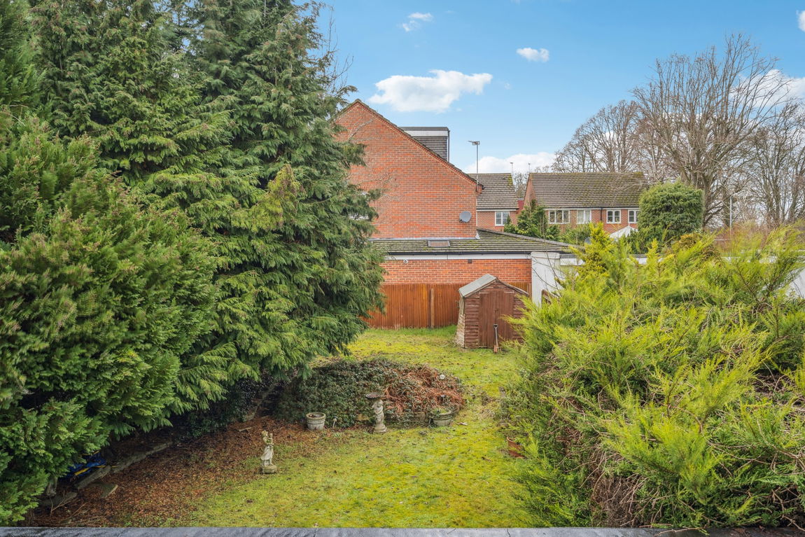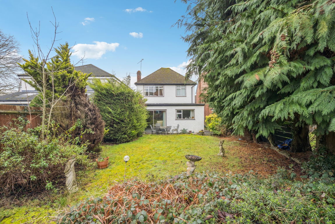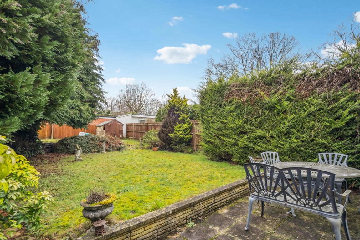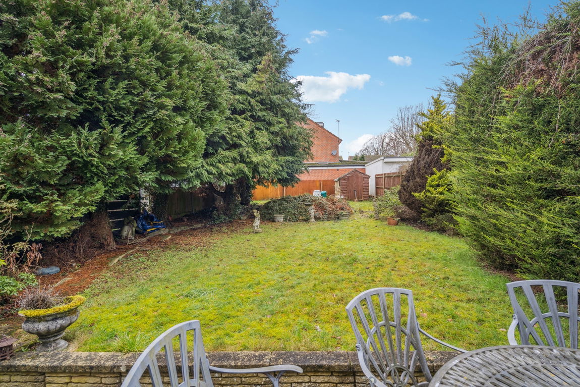 The garden is mainly laid to lawn with mature trees and shrubs, complemented by a patio area ideal for outdoor seating. To the front of the property is a driveway and side access to the rear garden.