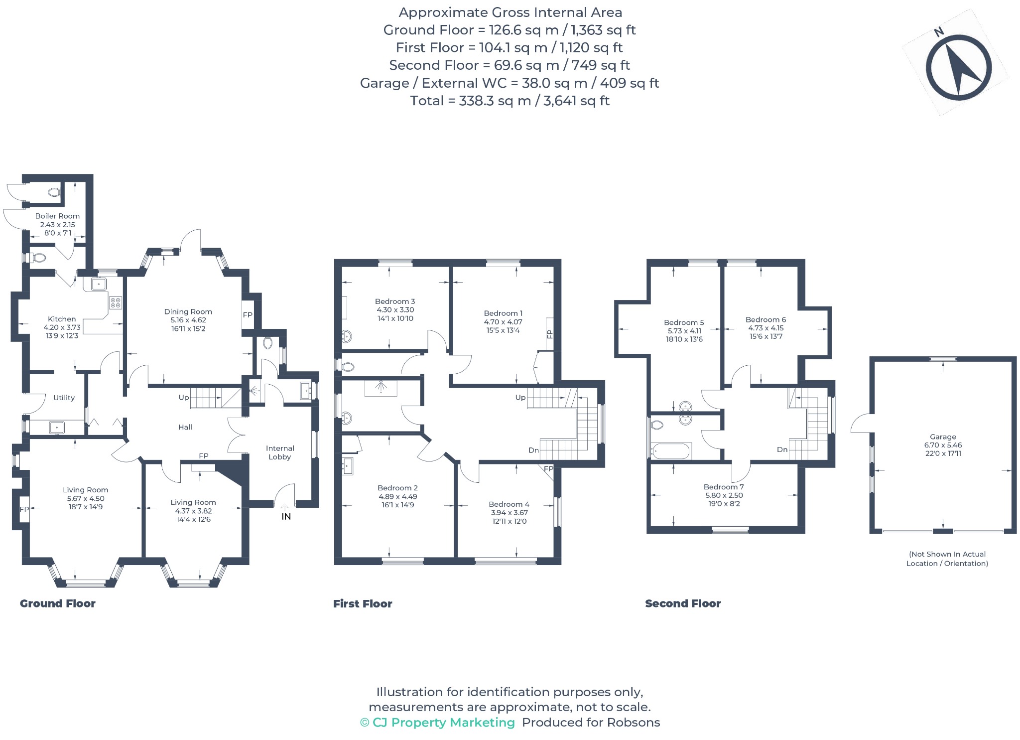 The ground floor comprises a large entrance lobby with a guest WC and shower room. Double doors open through to an entrance hall leading to three generous reception rooms, a kitchen with an adjoining utility room, a second WC, and a boiler room. On the first floor there is a spacious and light-filled landing providing access to four double bedrooms, a shower room, and a separate WC. Three additional bedrooms and a second family bathroom are located on the second floor.