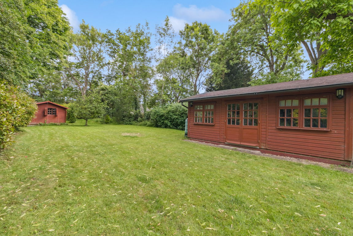 To the rear, a secluded garden provides a peaceful outdoor retreat, complete with a large outhouse offering space for a workshop, studio, or further storage. The front of the property boasts driveway parking and access to the garage.