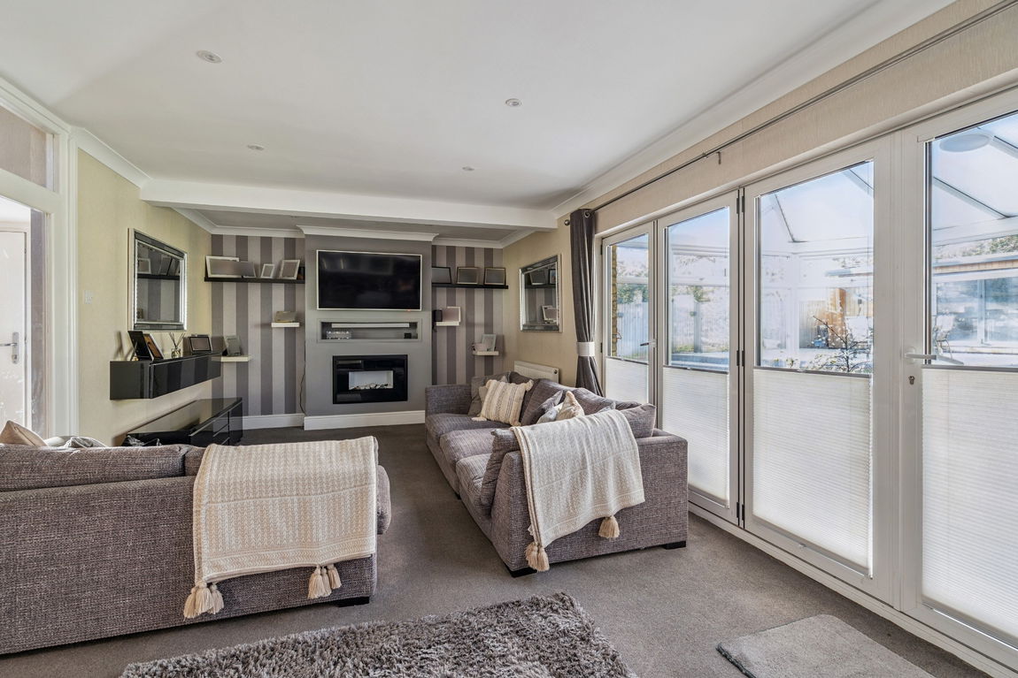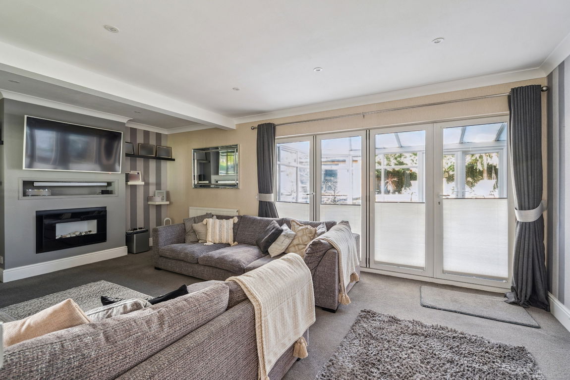 The ground floor comprises a large reception room with an adjoining conservatory, a well-equipped kitchen/breakfast room, a luxury family bathroom, and two double bedrooms. The first floor hosts two larger double bedrooms, both with fitted wardrobes, a second family bathroom, and access to eaves storage.