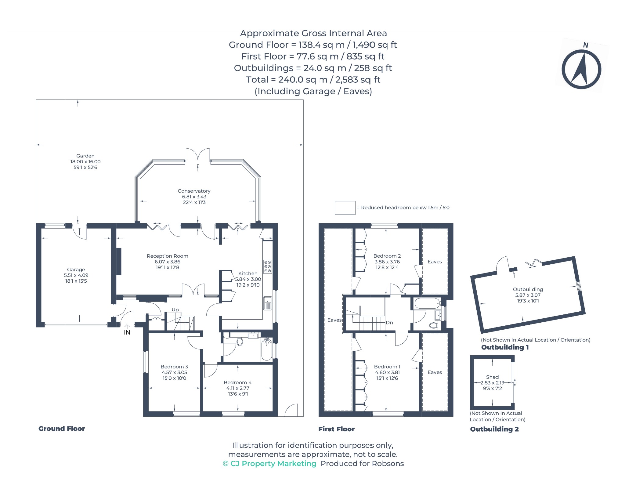 The ground floor comprises a large reception room with an adjoining conservatory, a well-equipped kitchen/breakfast room, a luxury family bathroom, and two double bedrooms. The first floor hosts two larger double bedrooms, both with fitted wardrobes, a second family bathroom, and access to eaves storage.