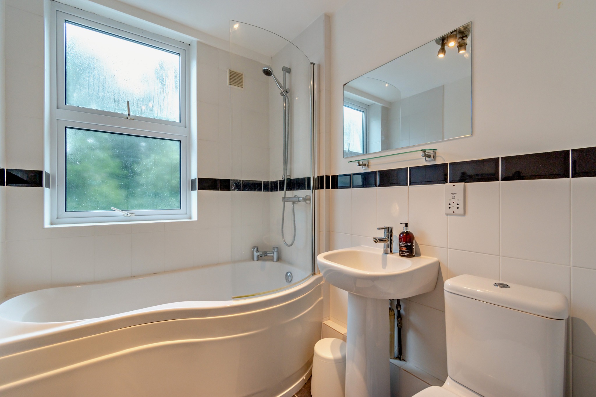 The inner hallway leads you to a modern double bedroom and a part-tiled bathroom with P-shaped bath and a separate storage cupboard.