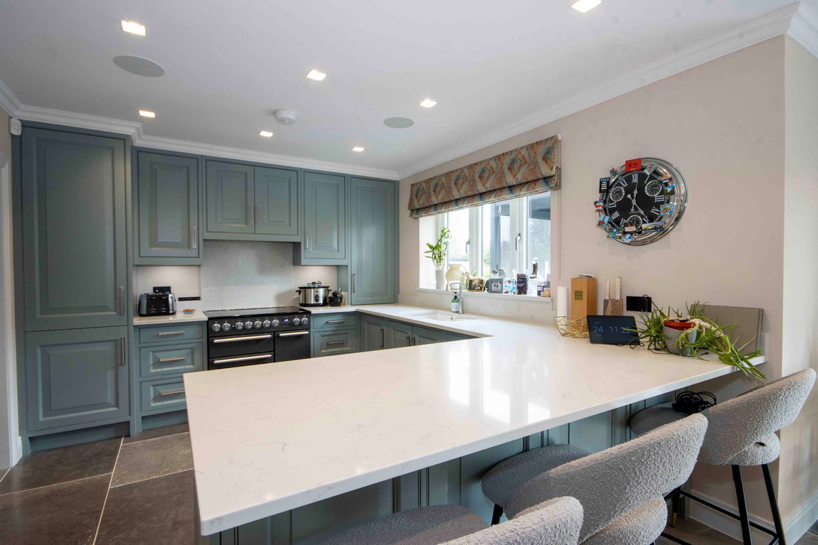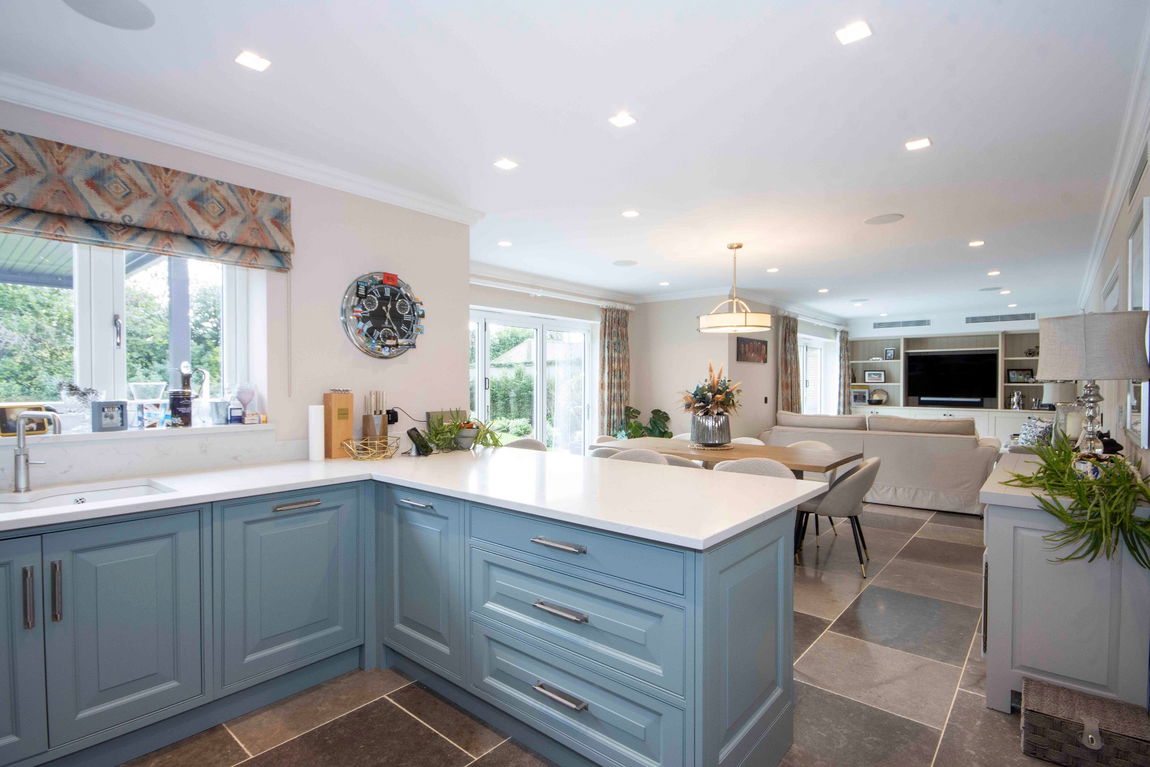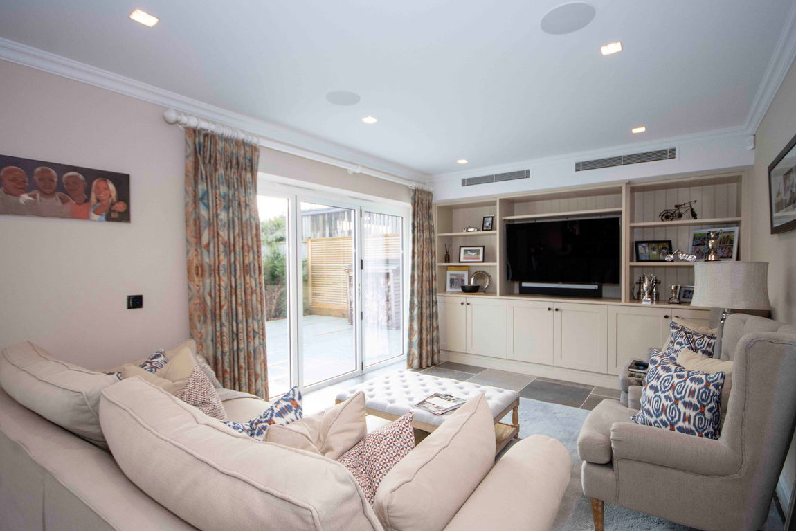 Upon entering, a generous hallway leads to a guest shower room, a practical cloak cupboard, and flows into a large open-plan reception and dining area, perfect for modern family living. French doors open directly onto the beautifully landscaped rear garden, bringing the outside in. Off the dining area is a charming music room, while the well-equipped kitchen features a range of fitted units and space for a breakfast table.