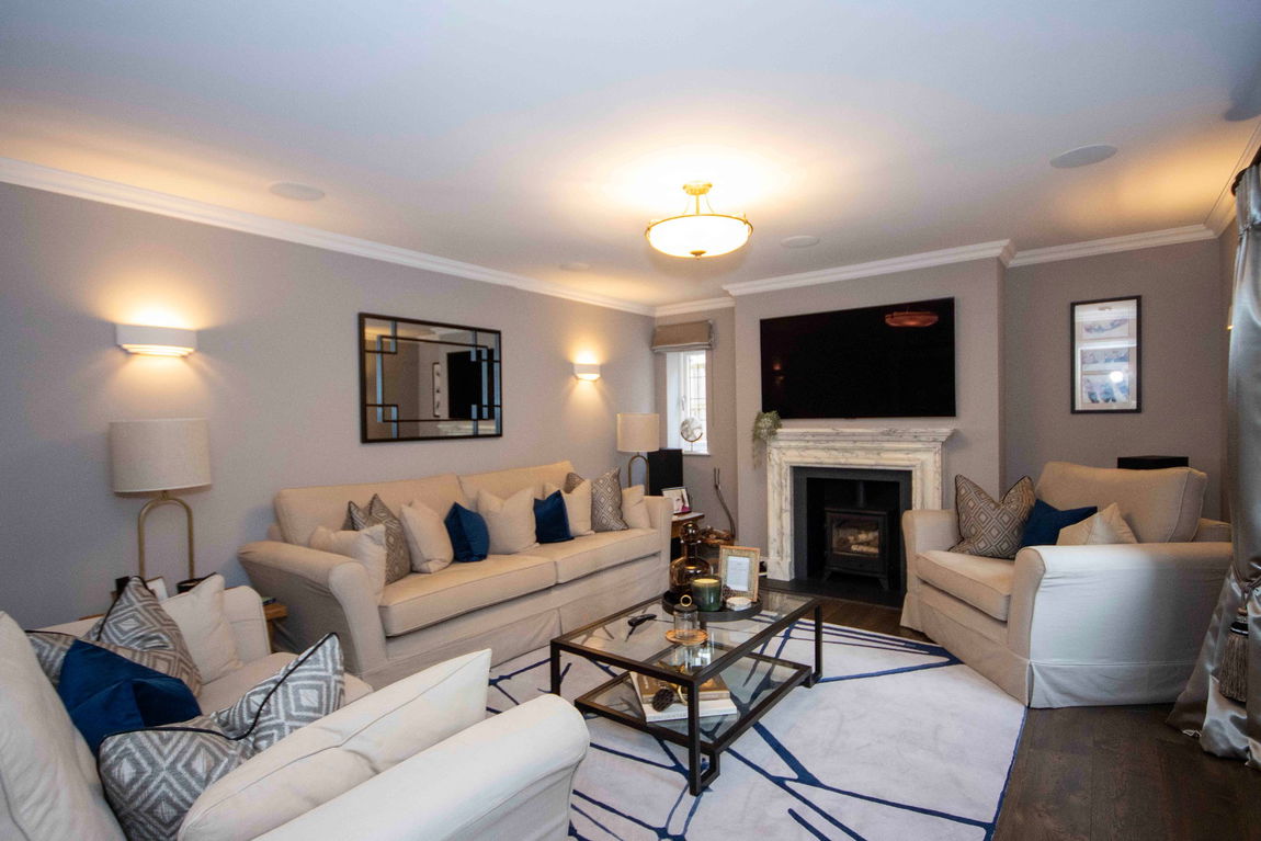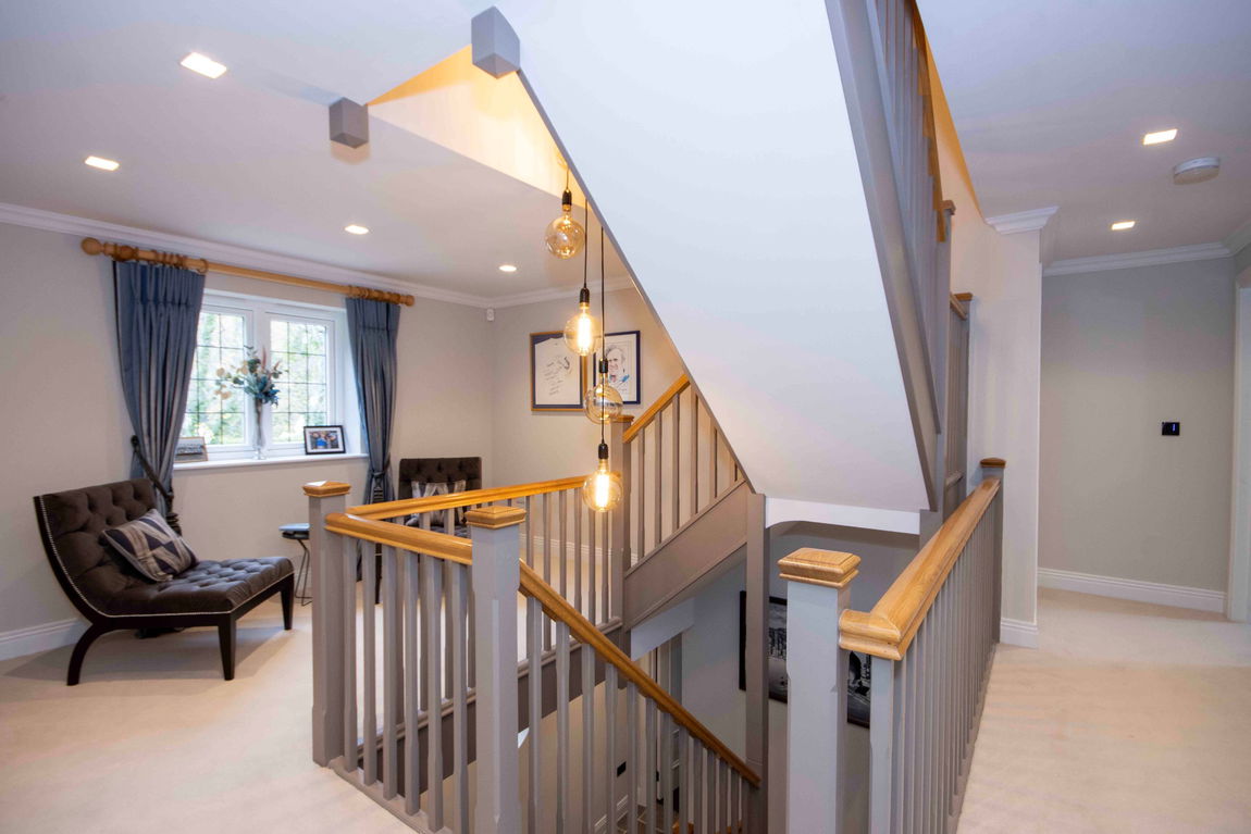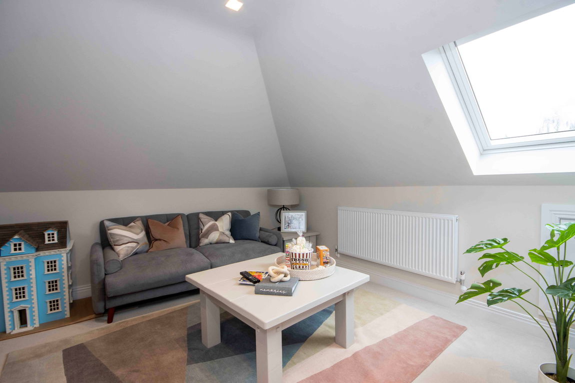 Upstairs, a spacious landing leads to four well-appointed bedrooms, two of which benefit from walk-in storage. The family bathroom and separate WC both feature underfloor heating and access to useful eaves storage.