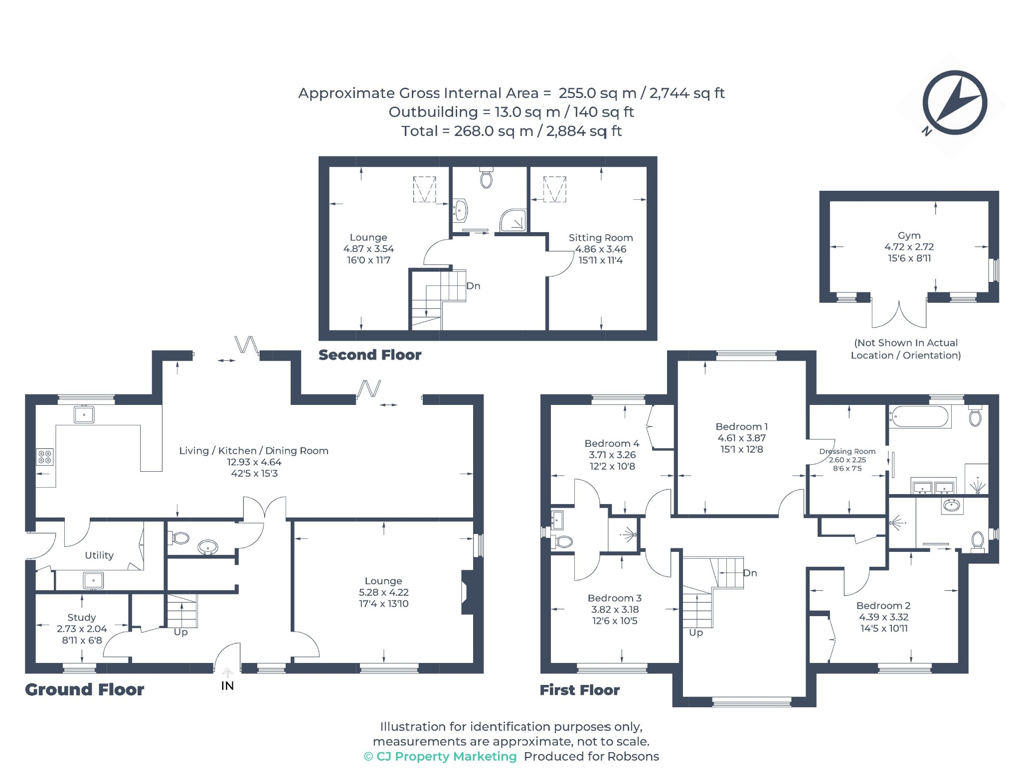 The spacious, first-floor landing leads to the impressive principal bedroom, which benefits from a dressing room and a luxury en-suite bathroom featuring a roll-top bath, a separate shower, and under-sink storage. Three further double bedrooms all enjoy access to en-suite shower rooms.