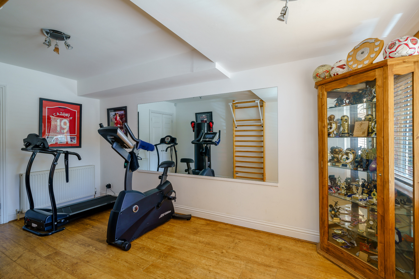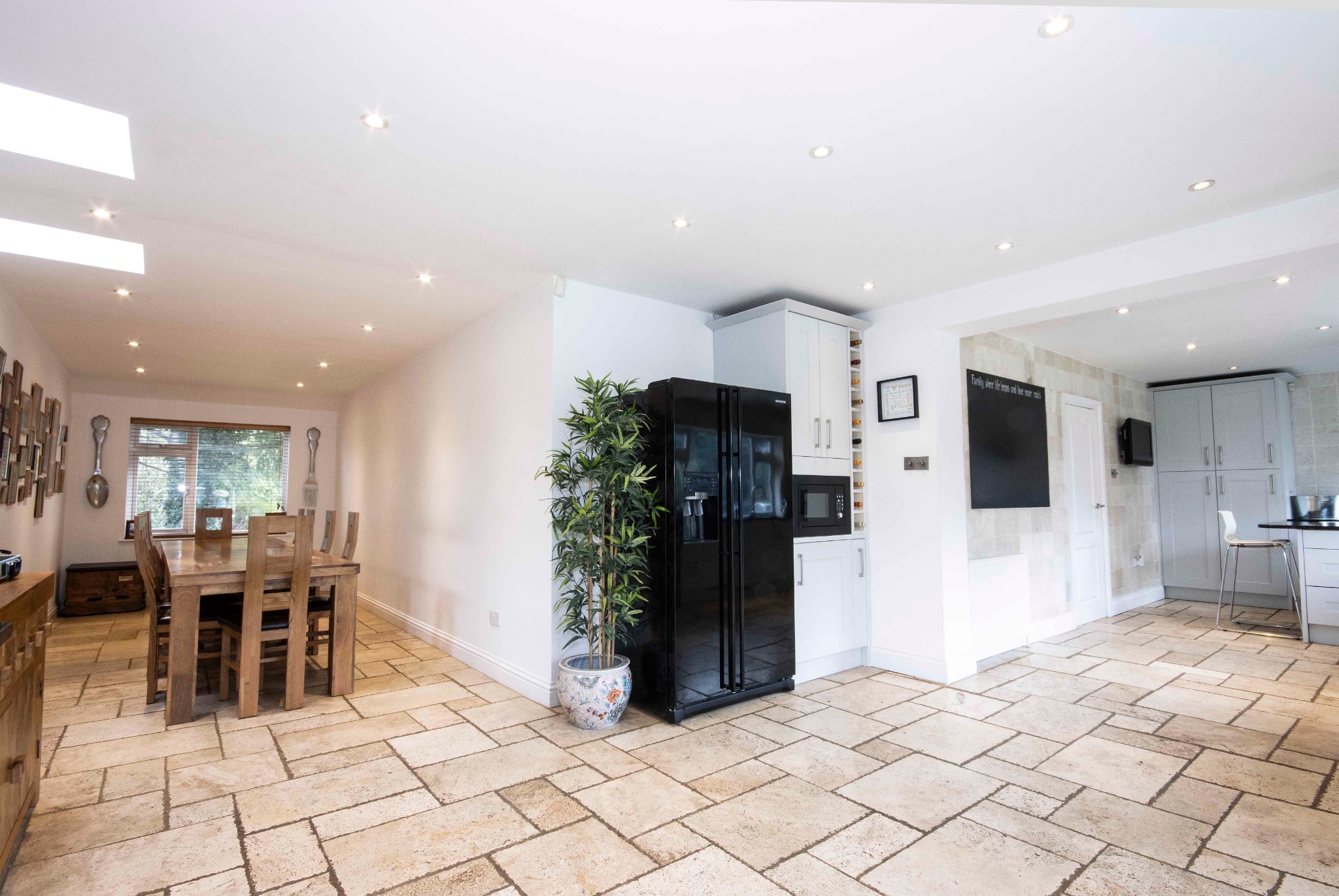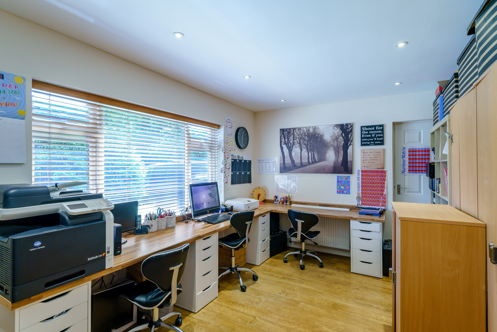 The welcoming entrance hall leads to the double aspect sitting room with French doors opening to the rear garden. There is an impressive kitchen/breakfast room designed by KBA Interiors with Travertine tiling, a breakfast bar, integrated appliances and French doors to the garden. The kitchen opens to the dining room. The ground floor also has a study leading to the integral garage, a further reception room currently used as a gym, laundry room with water softener and a ground floor bathroom.
