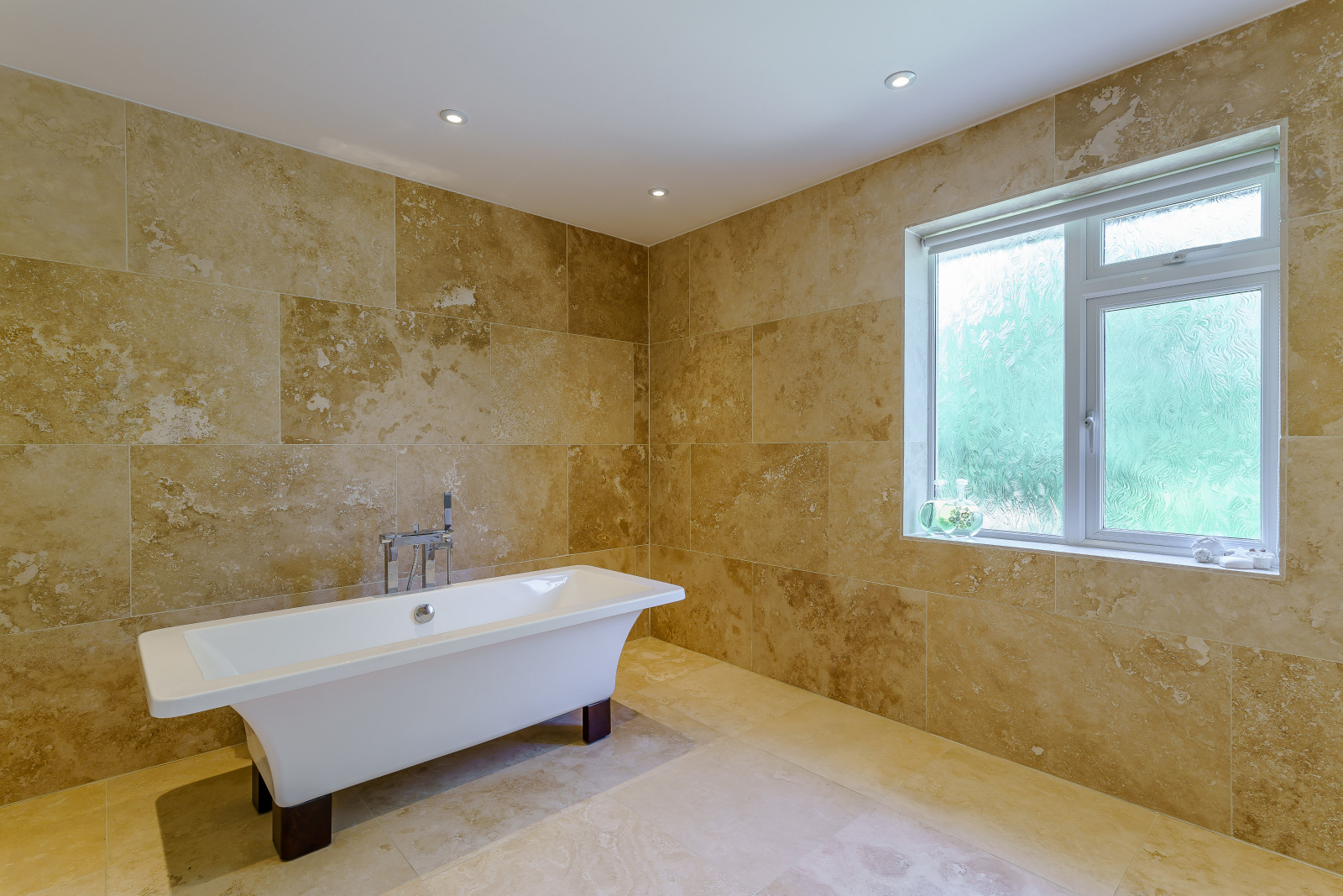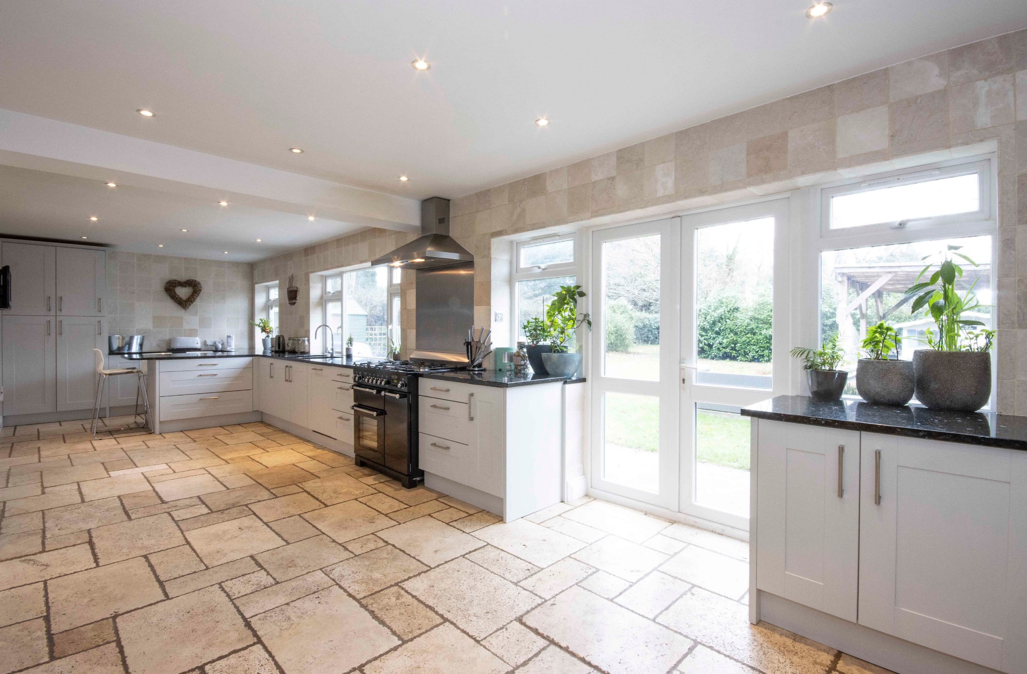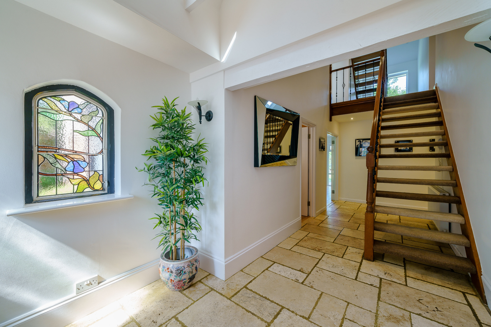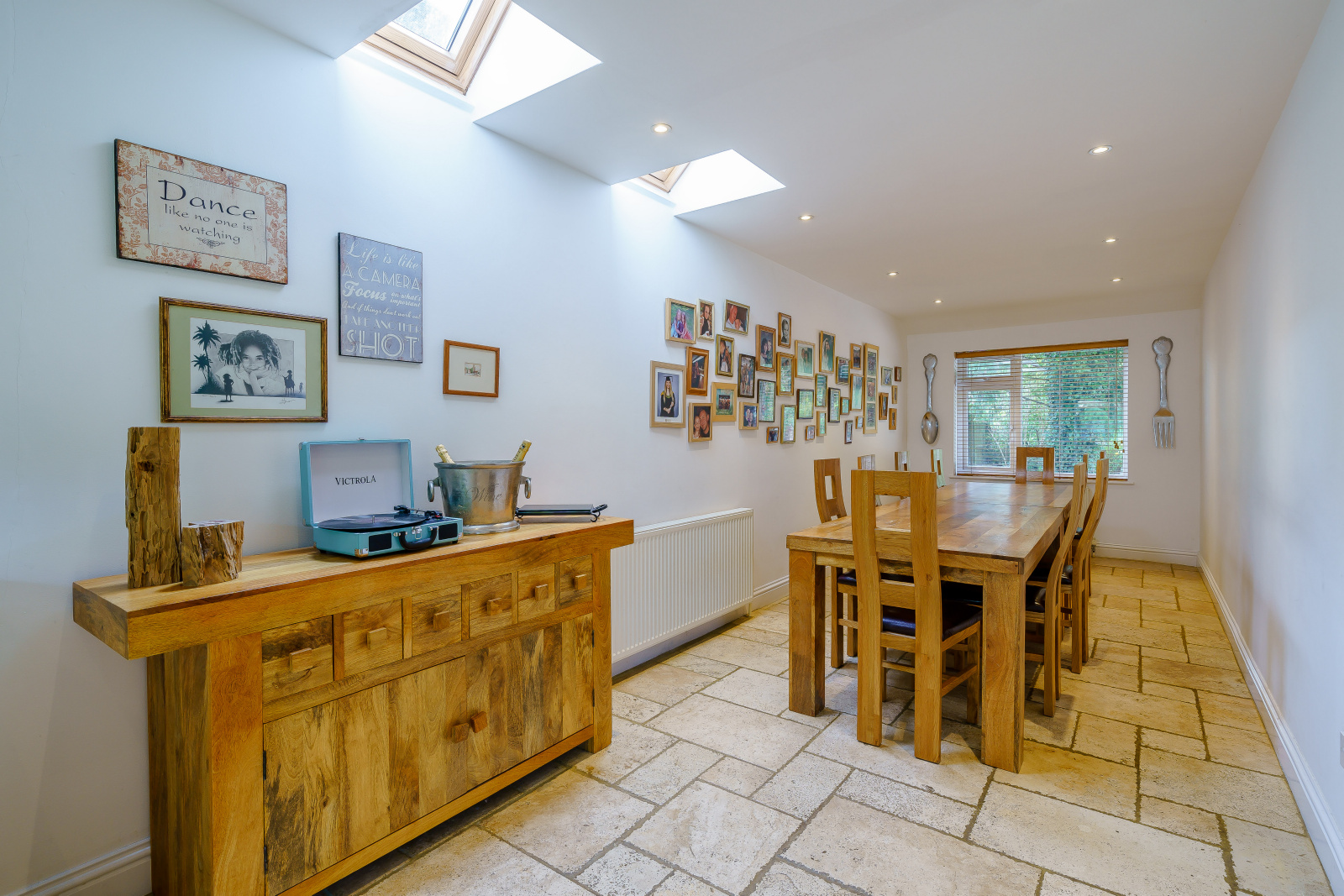 The welcoming entrance hall leads to the double aspect sitting room with French doors opening to the rear garden. There is an impressive kitchen/breakfast room designed by KBA Interiors with Travertine tiling, a breakfast bar, integrated appliances and French doors to the garden. The kitchen opens to the dining room. The ground floor also has a study leading to the integral garage, a further reception room currently used as a gym, laundry room with water softener and a ground floor bathroom.
