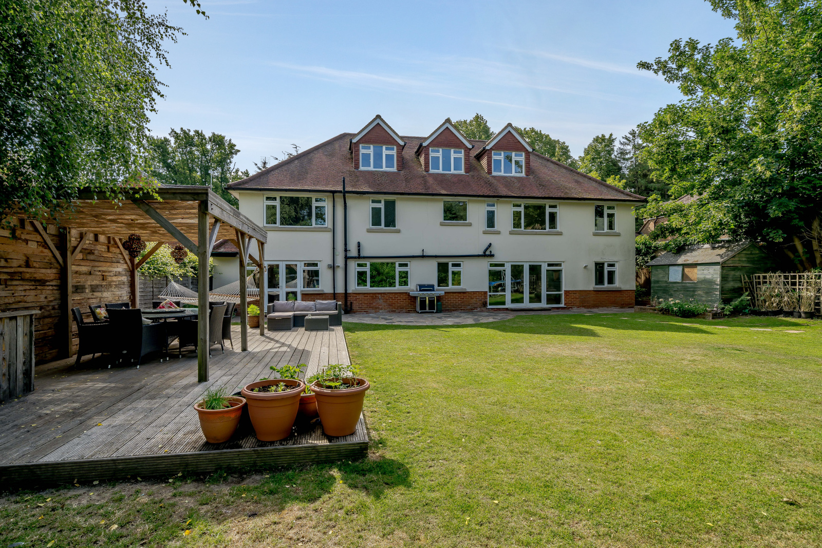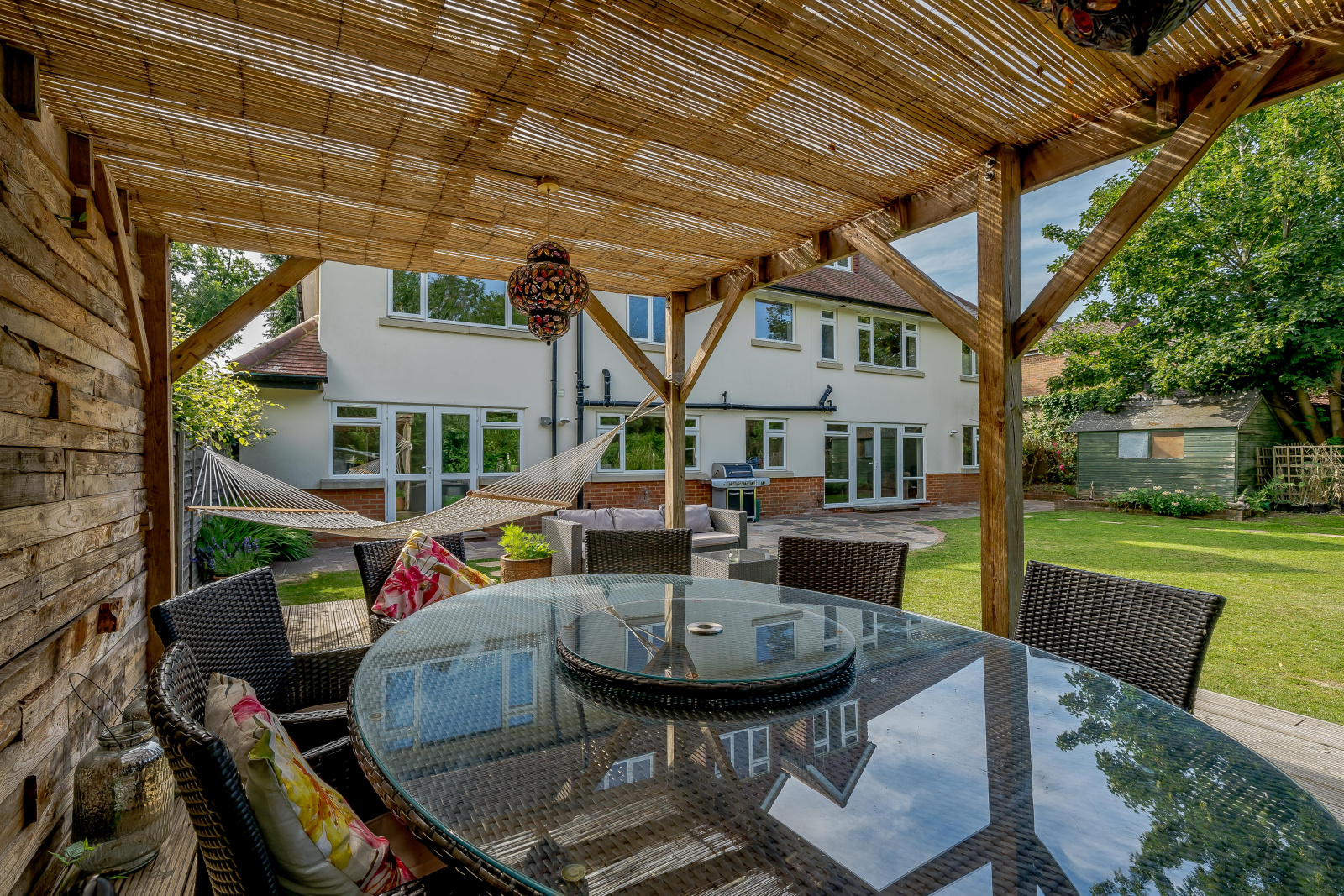 The property is approached via its own sizeable driveway with shrub borders, providing off street parking for numerous vehicles. Side access leads to the attractive rear garden which is mainly laid to lawn with mature borders and patio areas, one with a pergoda making this an ideal entertainment area.