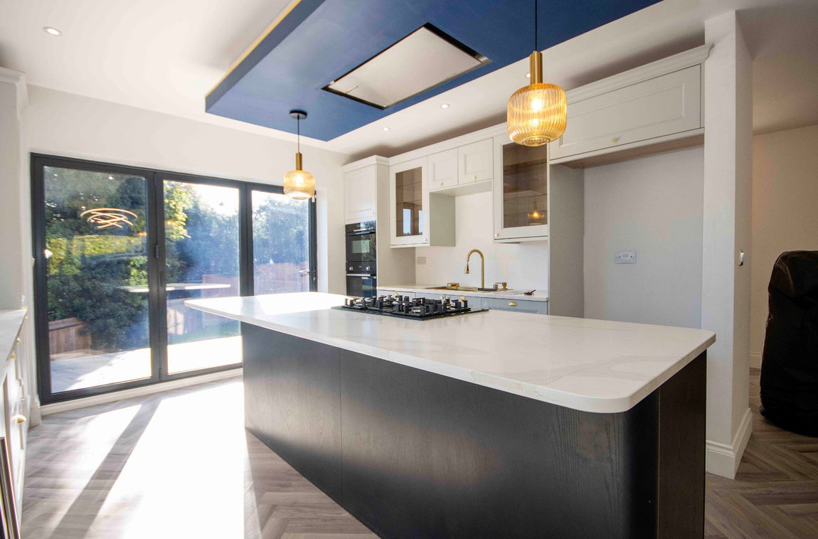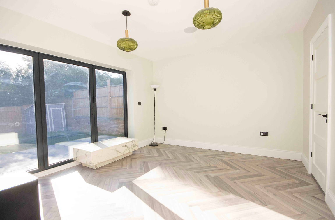 Upon entering, a spacious hallway leads you to an impressive 28'8" x 12'3" open-plan kitchen and light-filled living area, designed as the heart of the home. Bi-fold doors open out to the rear garden, seamlessly connecting indoor and outdoor living. The kitchen boasts a superb range of modern fitted units, high-spec Bosch and Samsung integrated appliances, and a stylish island/breakfast bar, ideal for casual dining and entertaining.