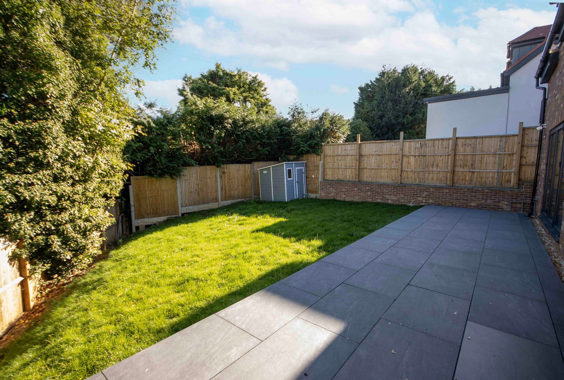 The property enjoys a private, landscaped rear garden laid to lawn, with a terrace perfect for outdoor dining and entertaining. To the front, there is a gated driveway providing parking for multiple vehicles, a front garden with a play area, and side access to the rear.