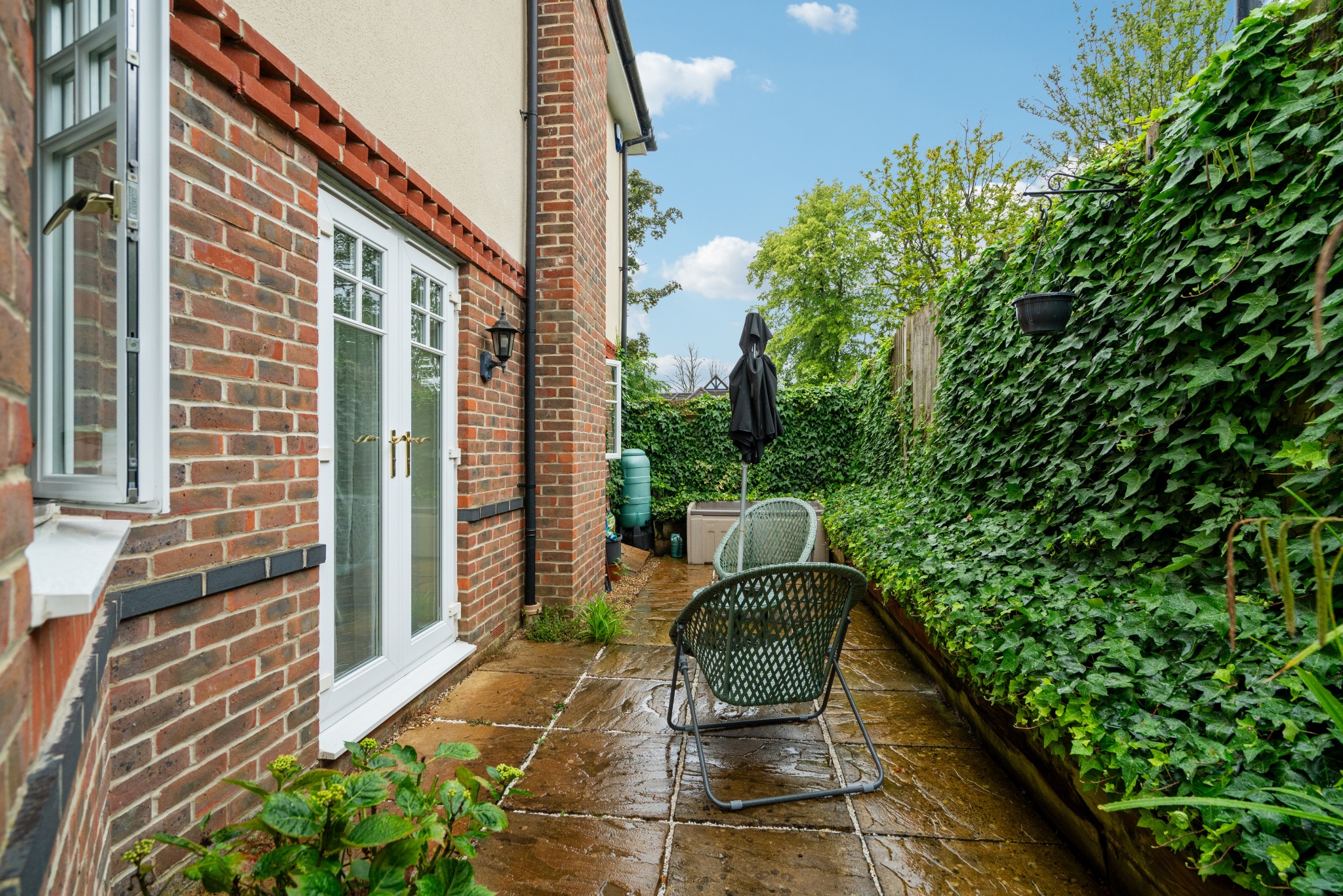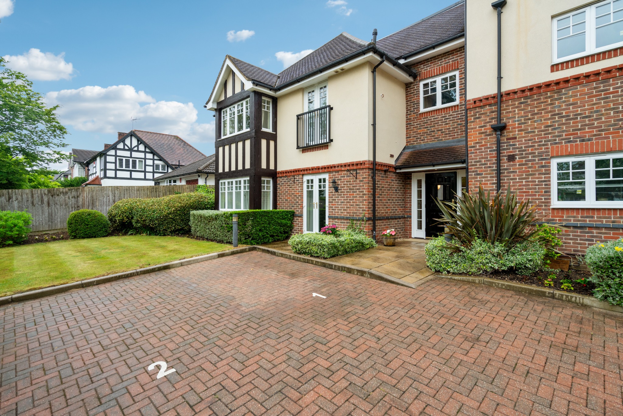 The development is set within well-maintained communal grounds, with a large garden and gated off-street parking.