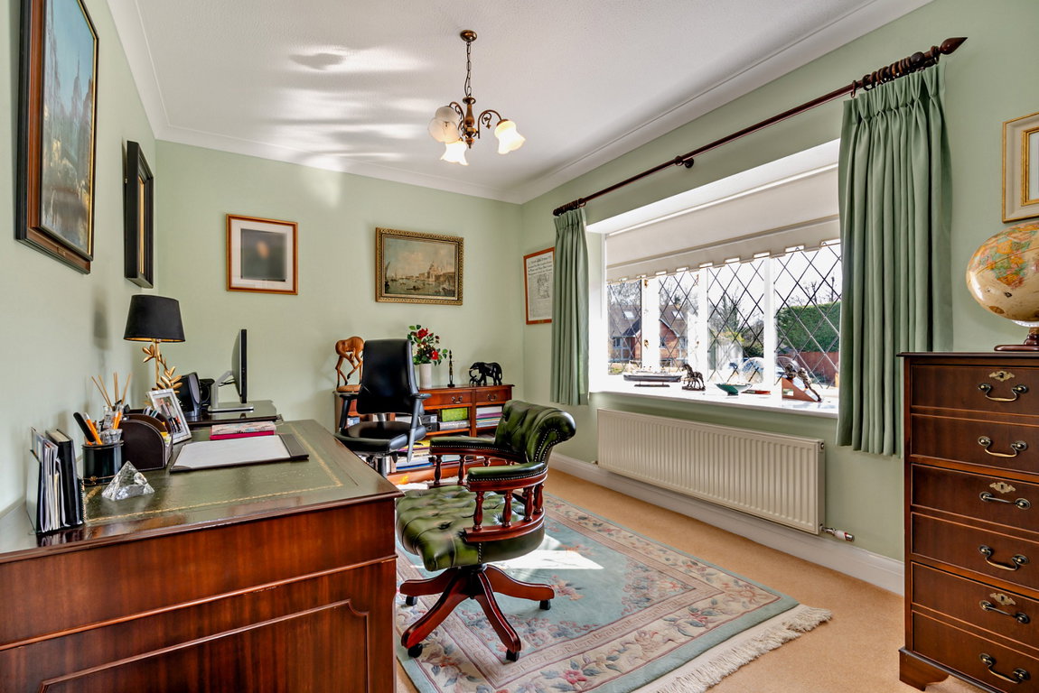 The ground floor has a light and bright entrance hallway with access to all the main living areas, kitchen and guest cloakroom. There is a front aspect family room and study with bay windows; a spacious living room with marble fireplace/ gas log effect fire with double French doors leading to the garden. There is a separate large dining room, also with doors to the garden.