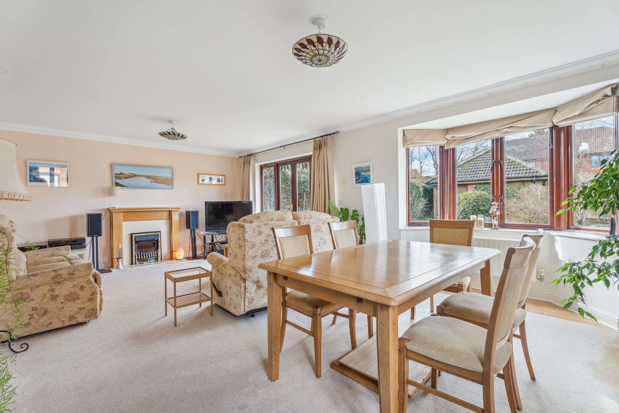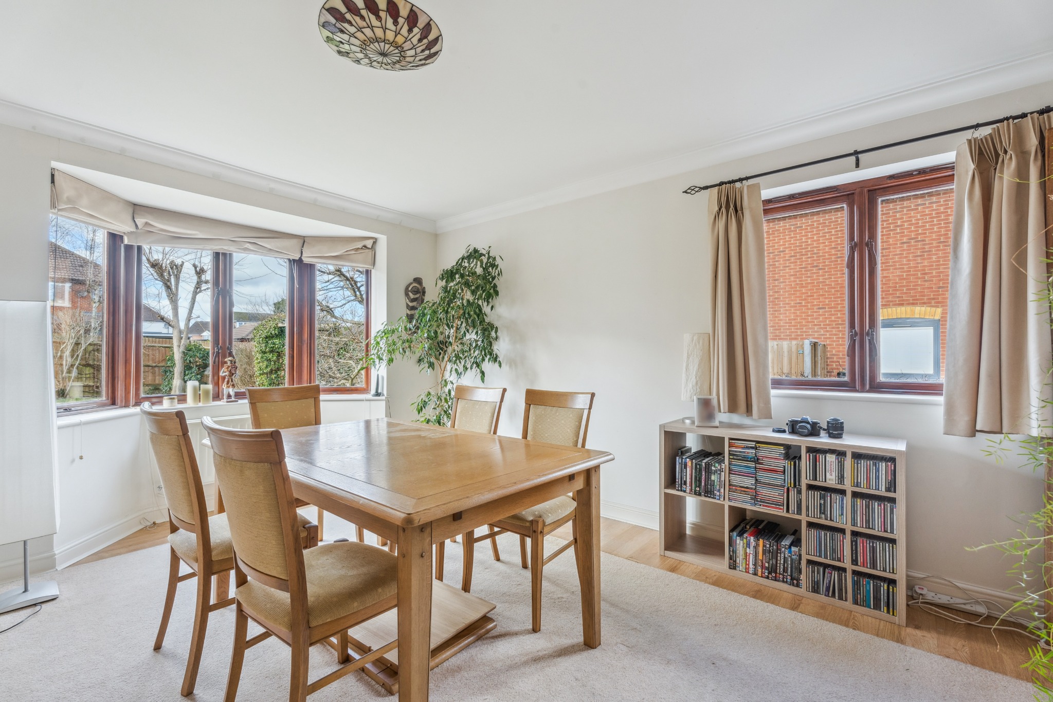 Offering spacious accommodation, the entrance hall leads to a spacious living room with a feature fireplace, a bay window and French doors opening out to the garden, a dining room also with a bay window and a guest cloakroom.