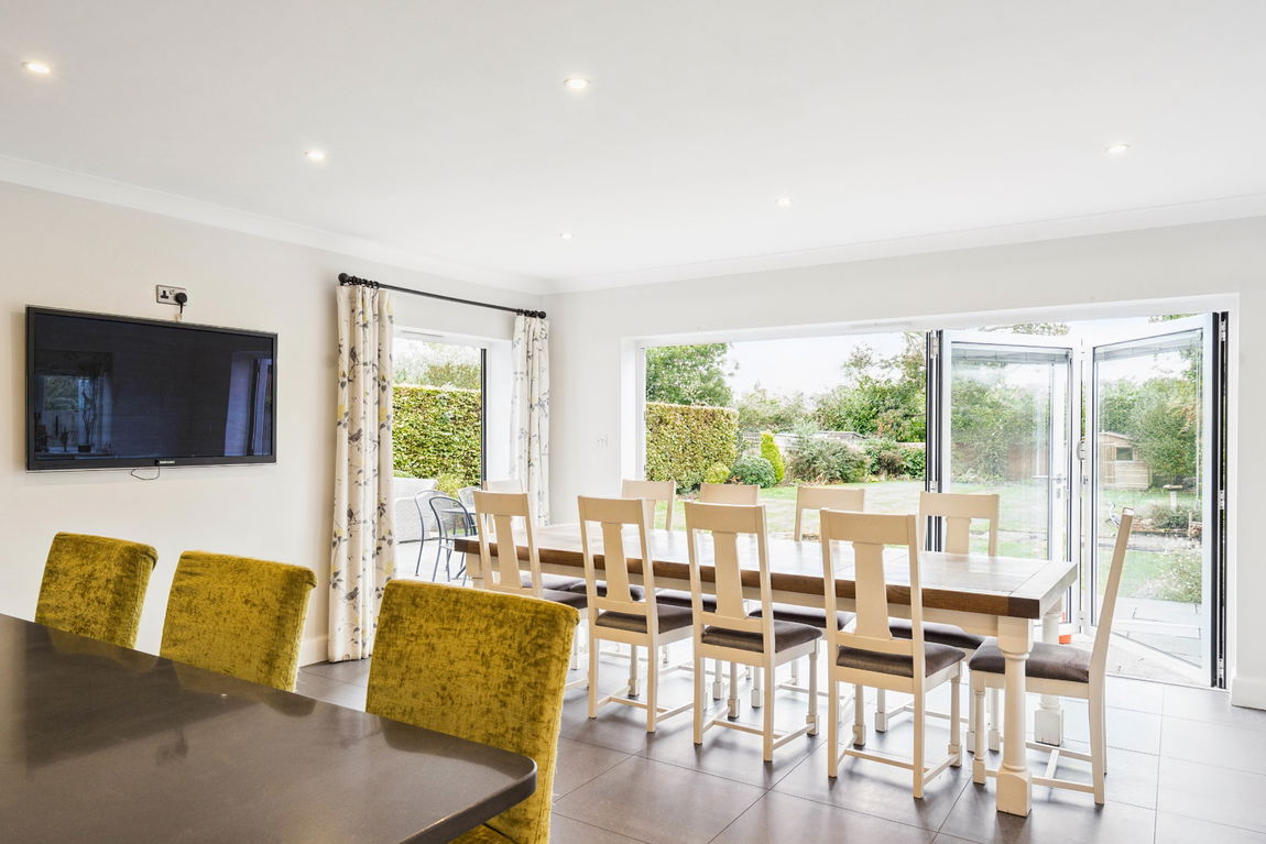 The ground floor welcomes you with a spacious entrance hallway, leading to a bright and elegant living room complete with a feature fireplace. At the heart of the home lies a large open-plan kitchen and dining area, featuring sleek contemporary units and bi-folding doors that open out to the rear garden – perfect for indoor/outdoor entertaining. Additional ground floor benefits include a separate utility room, two further reception rooms and a convenient downstairs w/c.