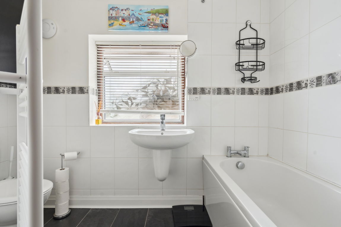 Upstairs, there are three bedrooms, two of which benefit from built-in wardrobes. A fully tiled family bathroom completes the first floor.