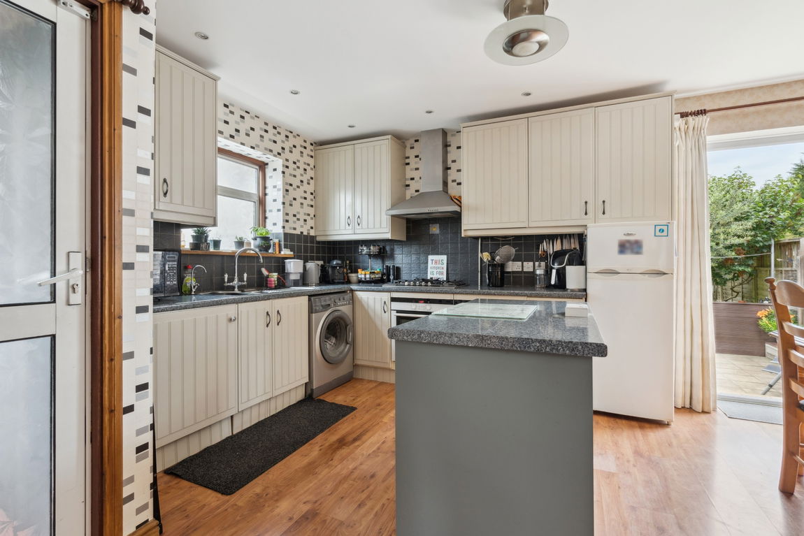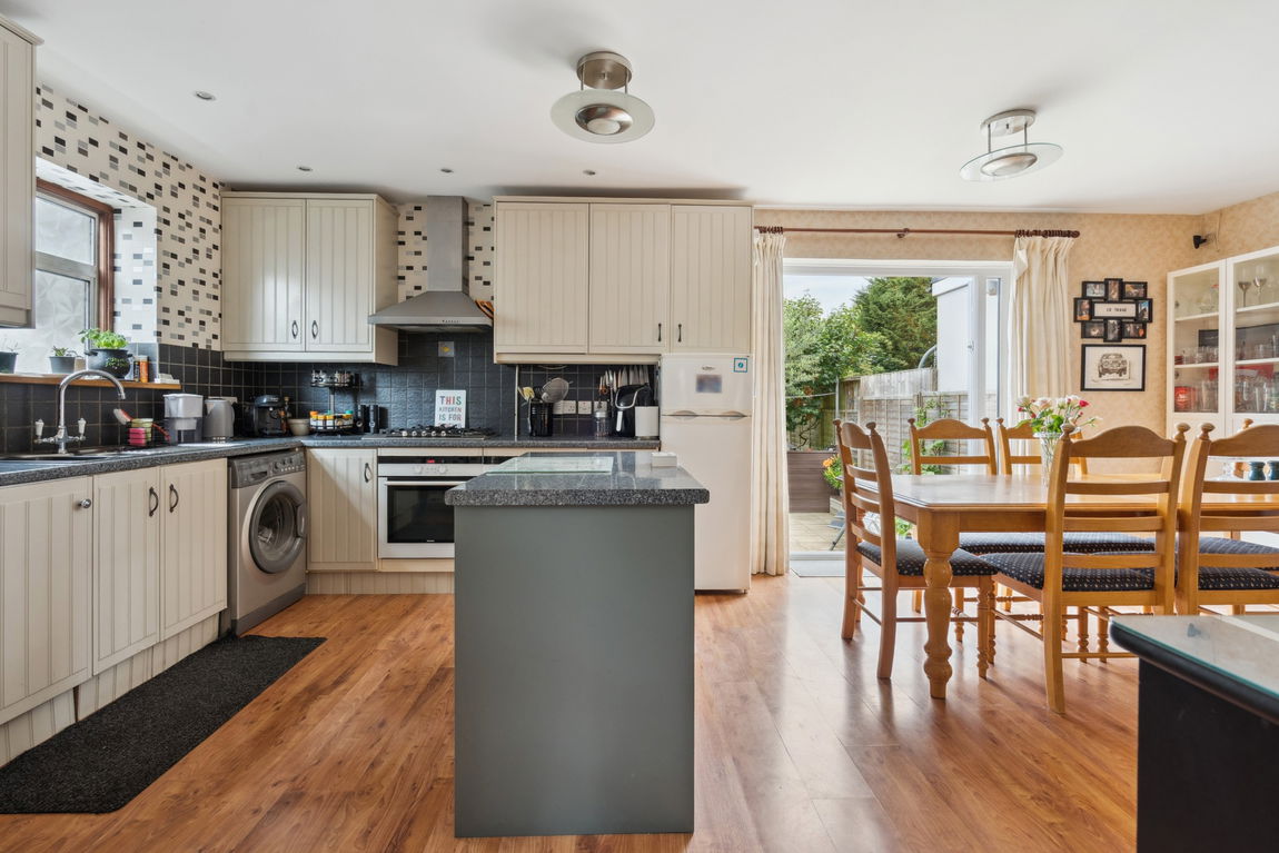 The ground floor welcomes you with a hallway featuring under-stairs storage. From here, you'll find a bright and airy open-plan kitchen/dining room, ideal for modern family living. The kitchen is well-equipped with a range of fitted units, space for freestanding appliances, and a kitchen island. French doors open out to a beautifully maintained garden and to the side of the property, with access to an outside WC.