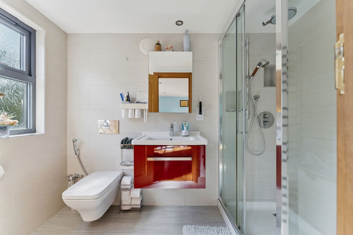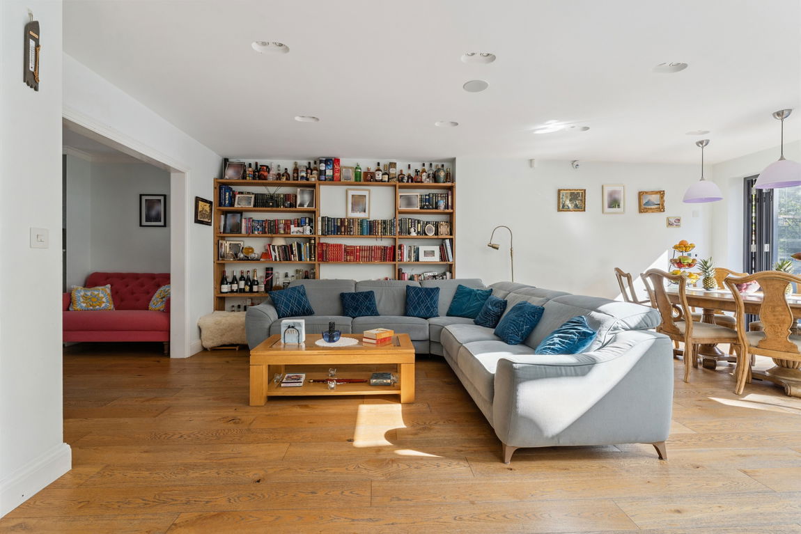 The ground floor comprises an entrance hallway with built-in storage, a front aspect sitting room, and a large kitchen / dining / living area with b-folding doors opening out to the garden. The kitchen is a modern, German fitted kitchen with neutral units, integrated appliances, and ample storage space, with the added benefit of a separate utility room that in turn leads to a ground floor WC and shower. Further benefits include Sonos integrated ceiling speakers, remote-controlled skylights, underfloor heating, and access to a garage/store room, providing potential for conversion if needed.