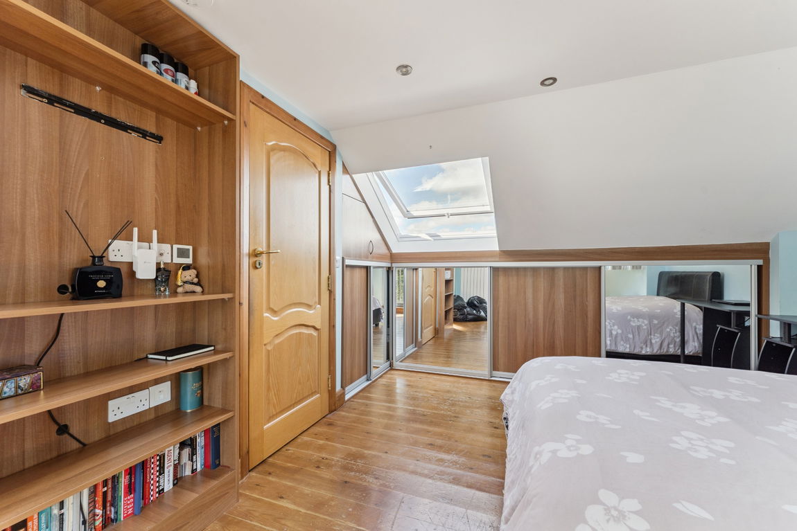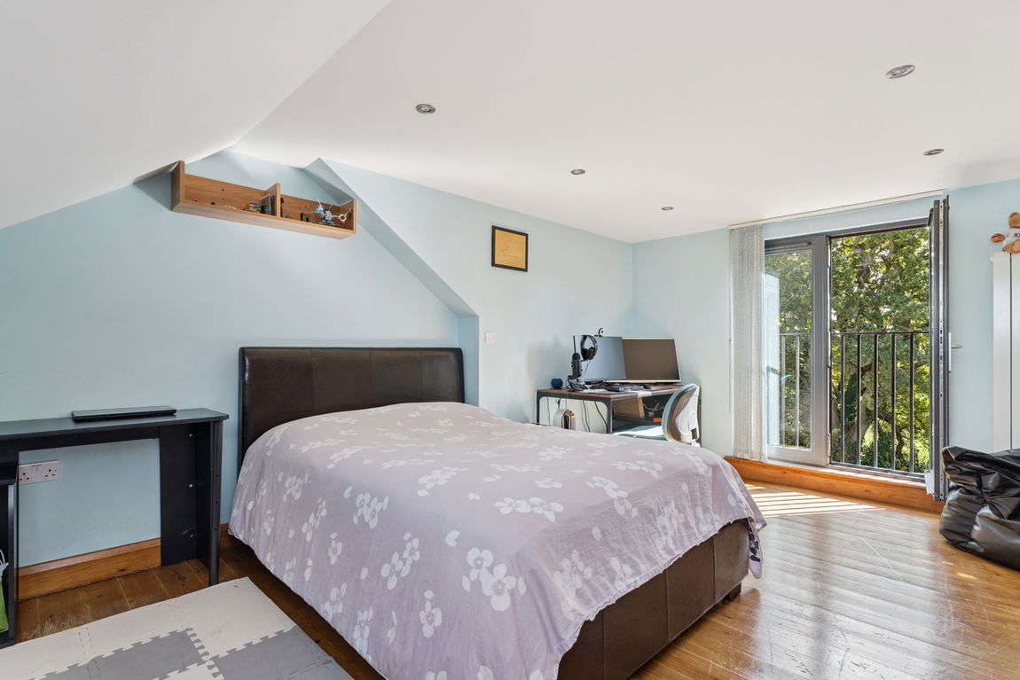 Two large double bedrooms are located on the first floor, both with fitted wardrobes, along with a further bedroom and a family bathroom. The second floor hosts the principal bedroom boasting a Juliet balcony and an en-suite shower room.