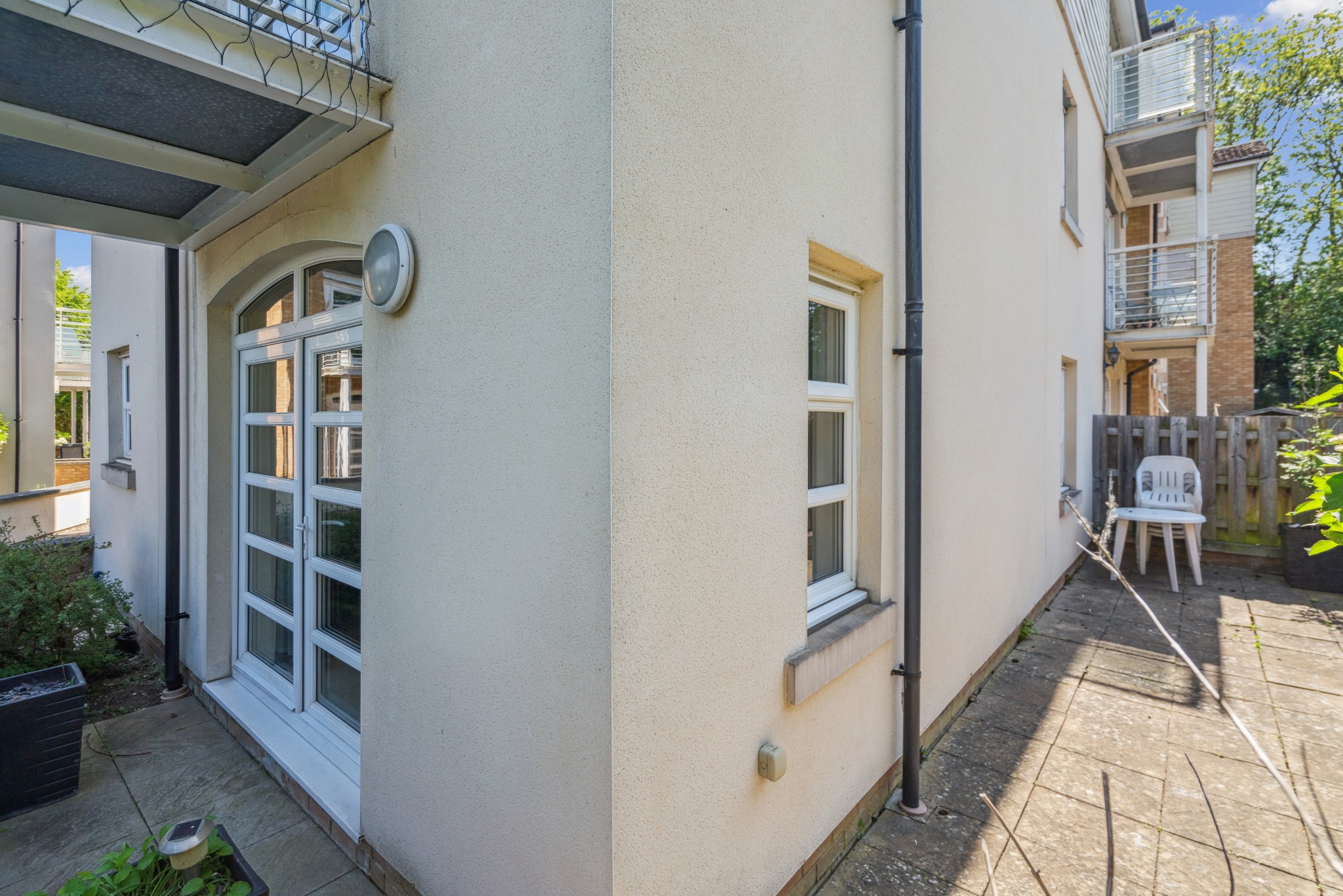 The principal bedroom boasts fitted wardrobes, an en-suite shower room, and French doors providing additional outdoor access. A second double bedroom also benefits from built-in wardrobes, and there is a modern family bathroom with a full-sized bath.