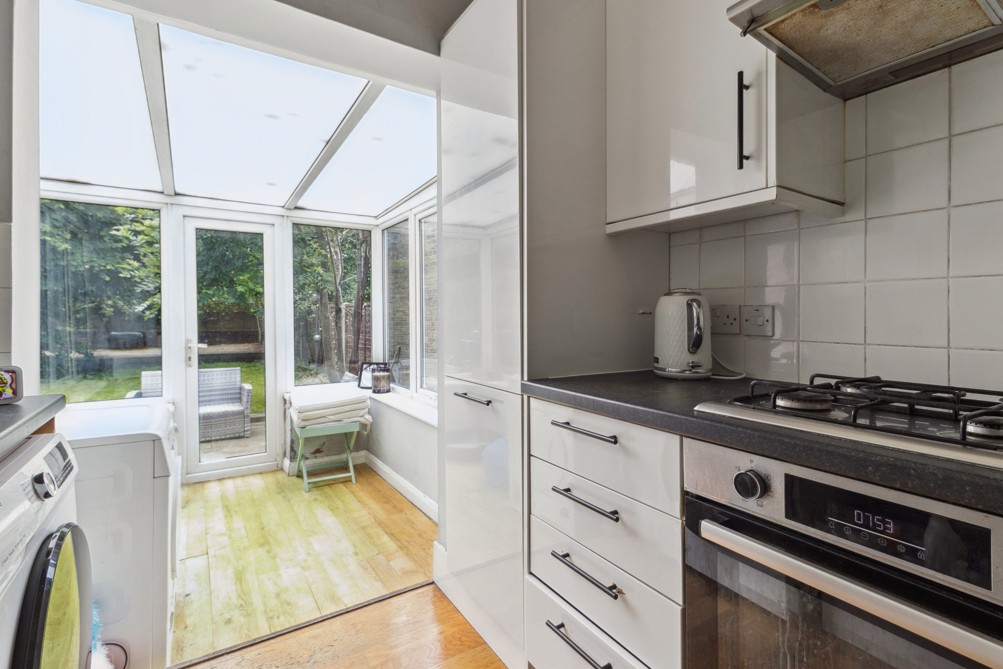 To the rear of the property, the well-appointed kitchen boasts a range of fitted units and space for freestanding appliances, flowing seamlessly into a bright and airy conservatory with a French door opening onto the garden.