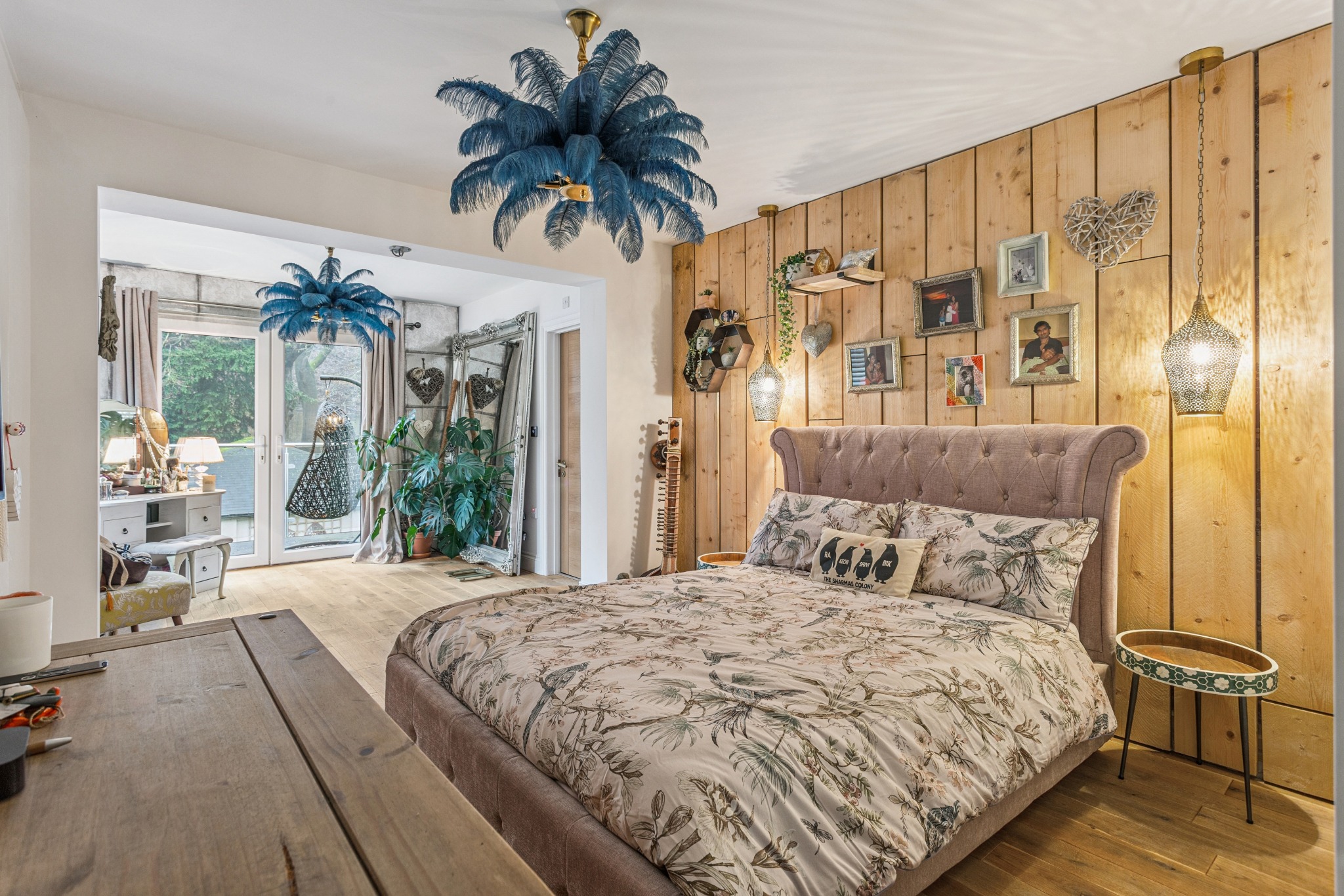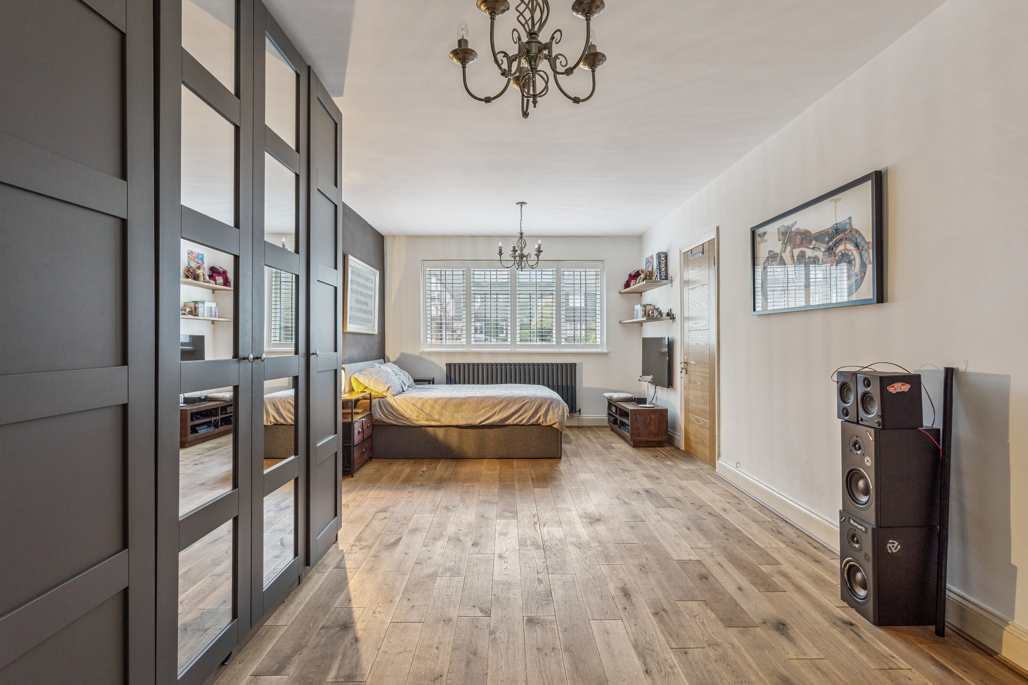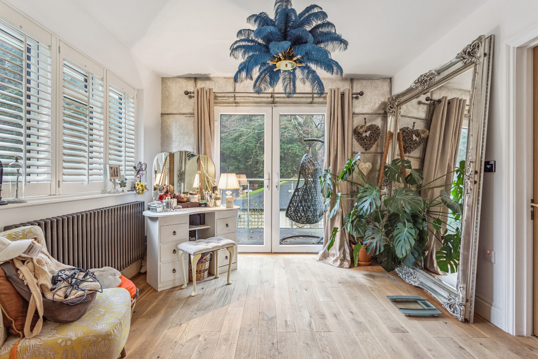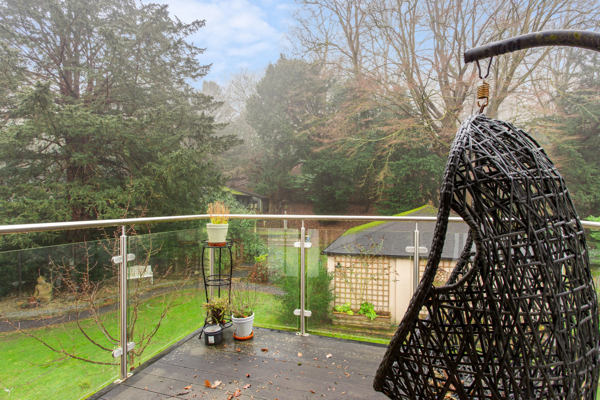 Upstairs, the principal bedroom suite is a true retreat, featuring fitted wardrobes, a luxurious en-suite shower room with his and hers basins, and French doors opening onto a private balcony overlooking the garden. There are three further well-proportioned bedrooms, all with fitted wardrobes, including one with its own en-suite shower room, as well as a modern family shower room.