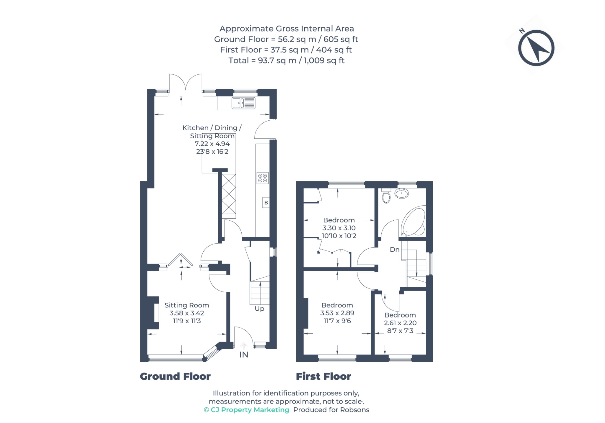 The ground floor comprises a front-aspect sitting room with a feature fireplace and French doors leading to a spacious, open-plan kitchen/dining/sitting room.