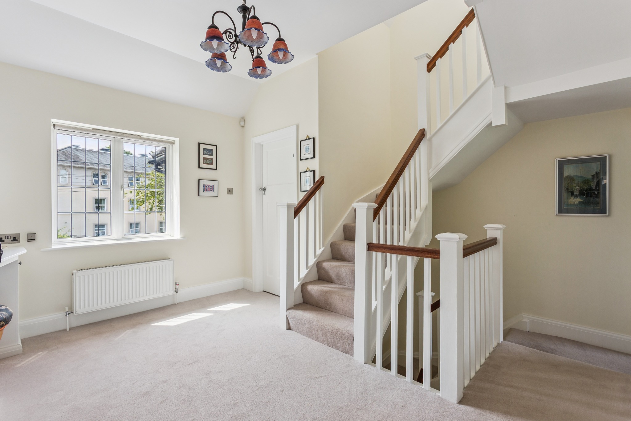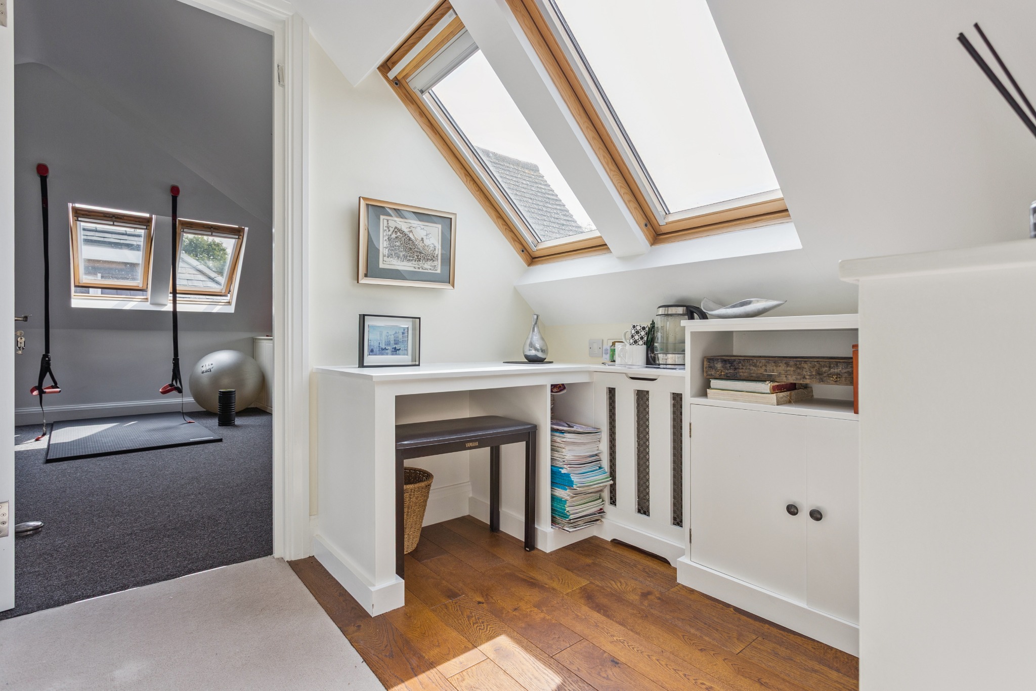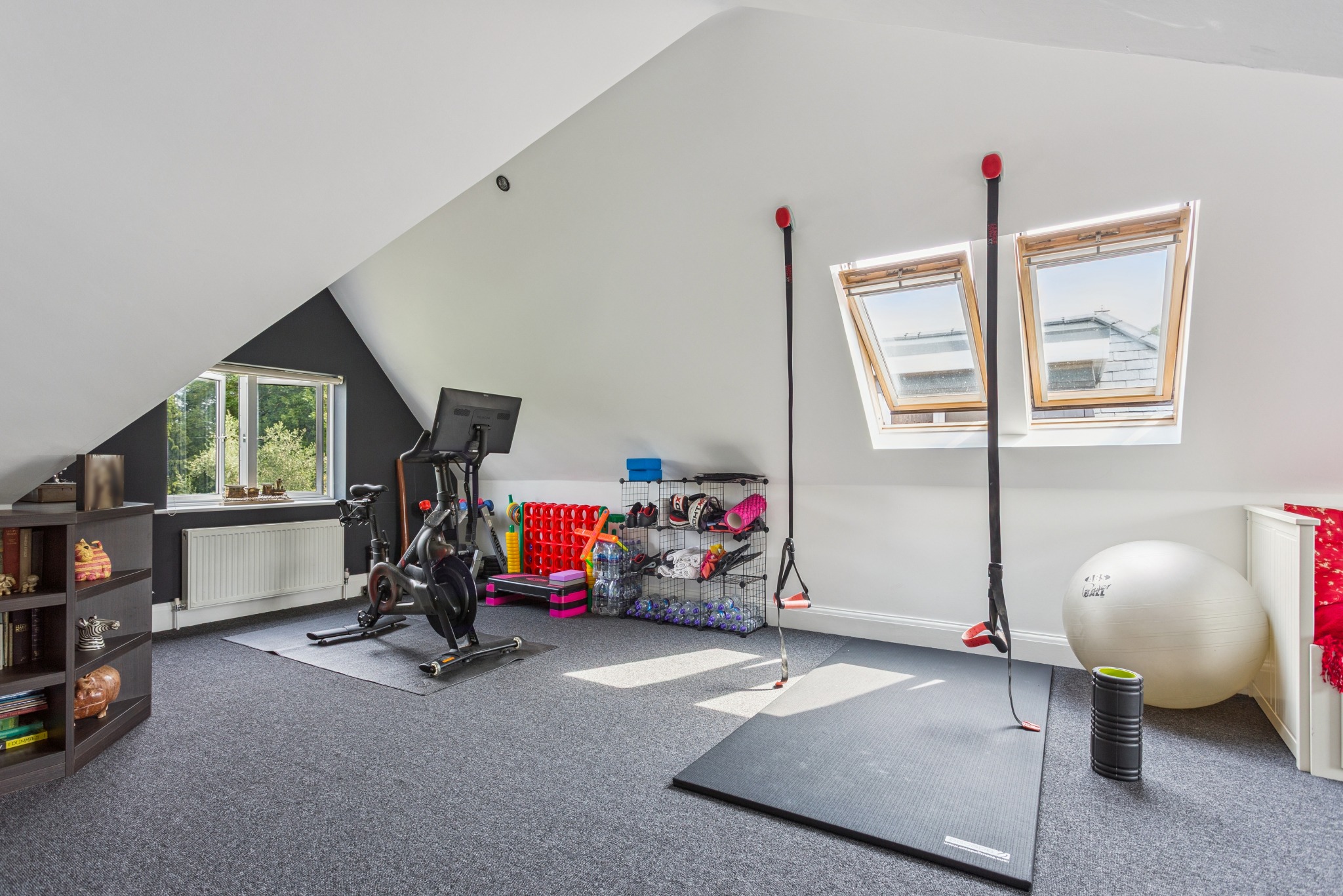 The first floor hosts four good-sized double bedrooms, three of which benefit from en-suite shower rooms, and a luxury family bathroom with a freestanding bath tub. A large double bedroom, currently utilised as a gym, is located on the second floor, along with a study and access to eaves storage.