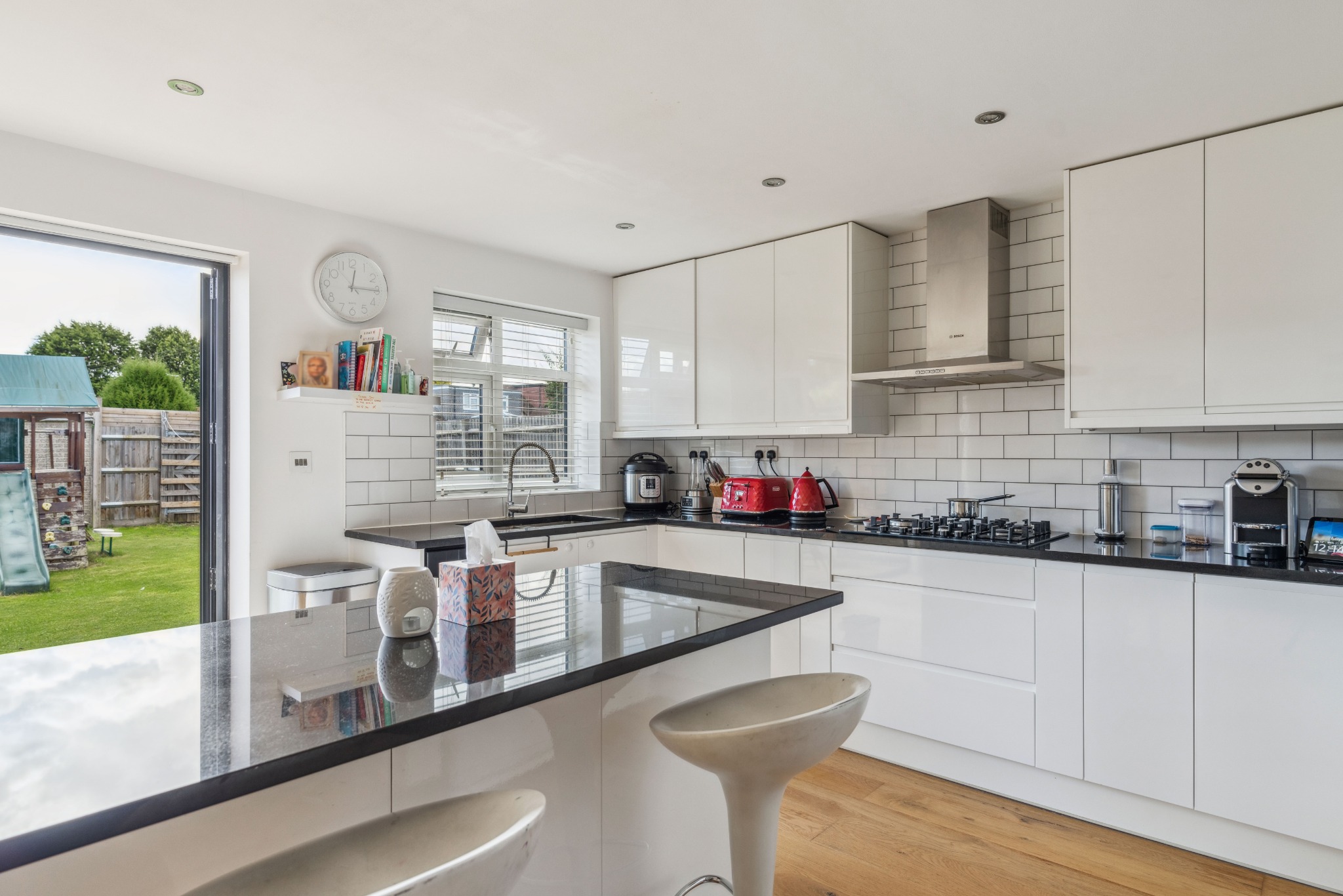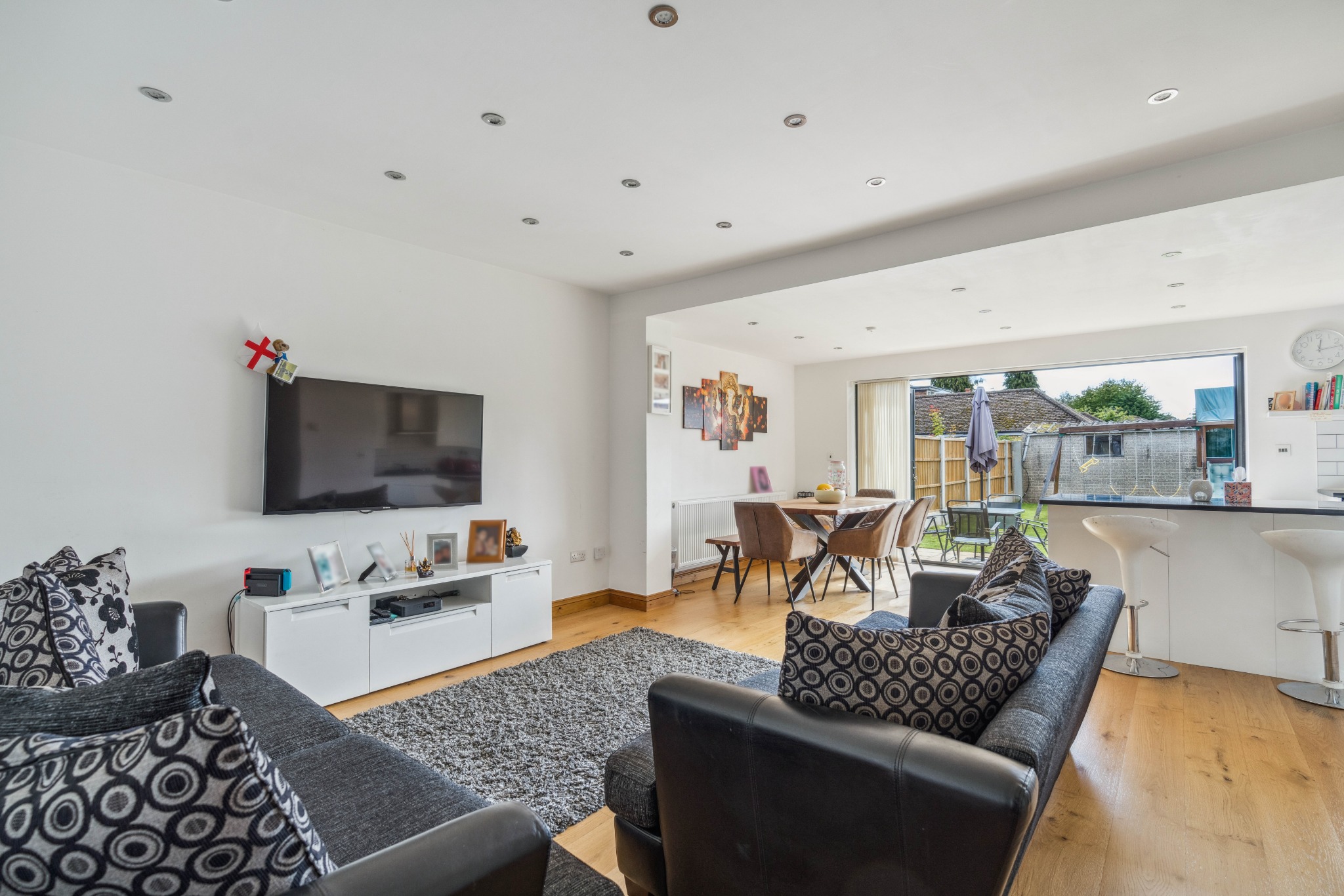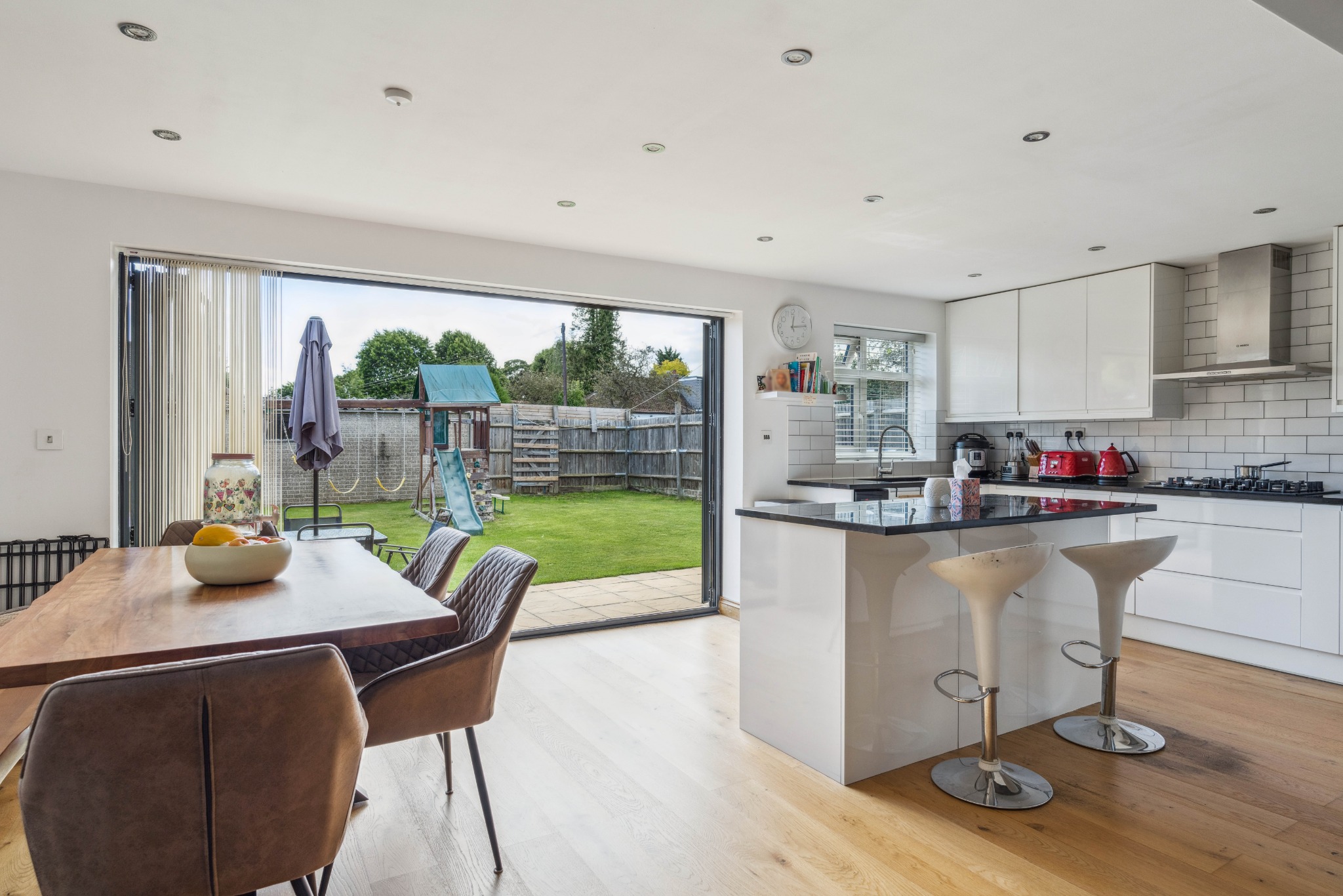 The property comprises an entrance porch and hallway which opens up to a contemporary kitchen / dining / living area, creating the ideal social space for families. The modern fitted kitchen offers a variety of units with integrated appliances and a large kitchen island, with the added benefit of a separate utility room. There is plenty of space for a family dining area with bi-folding doors opening out to the garden, along with a living area. Completing the property are two double bedrooms with fitted wardrobes, a further bedroom, and a family bathroom with an additional separate WC.