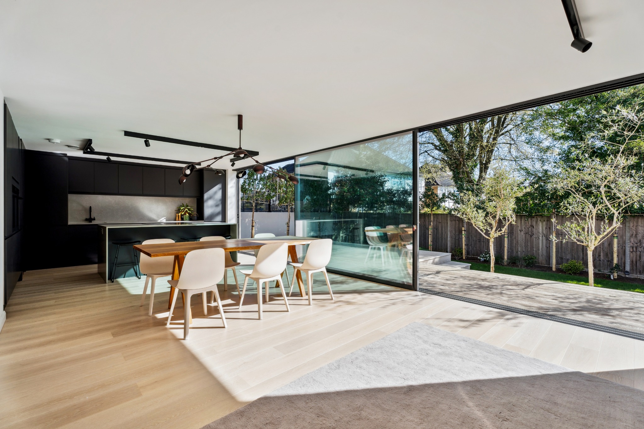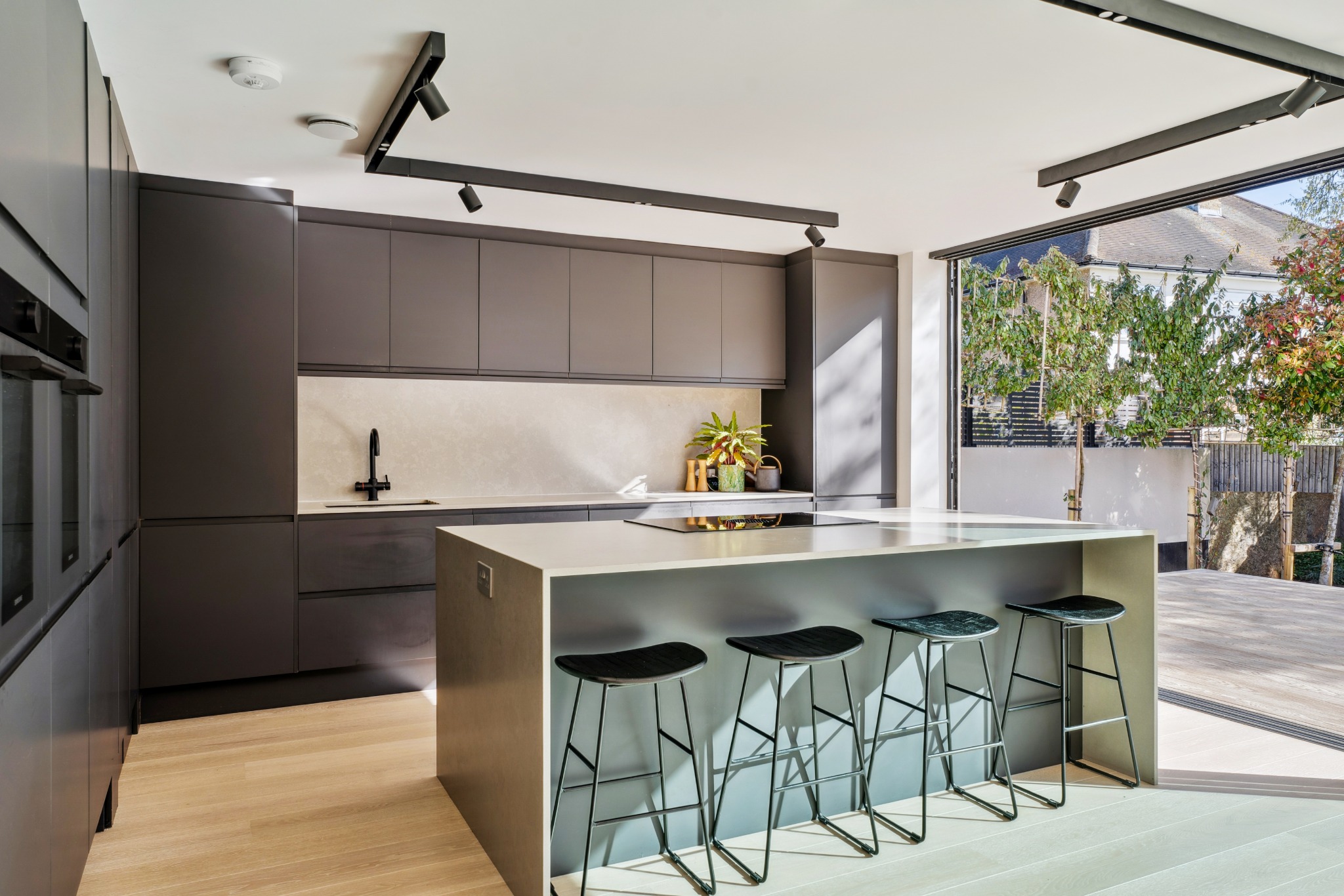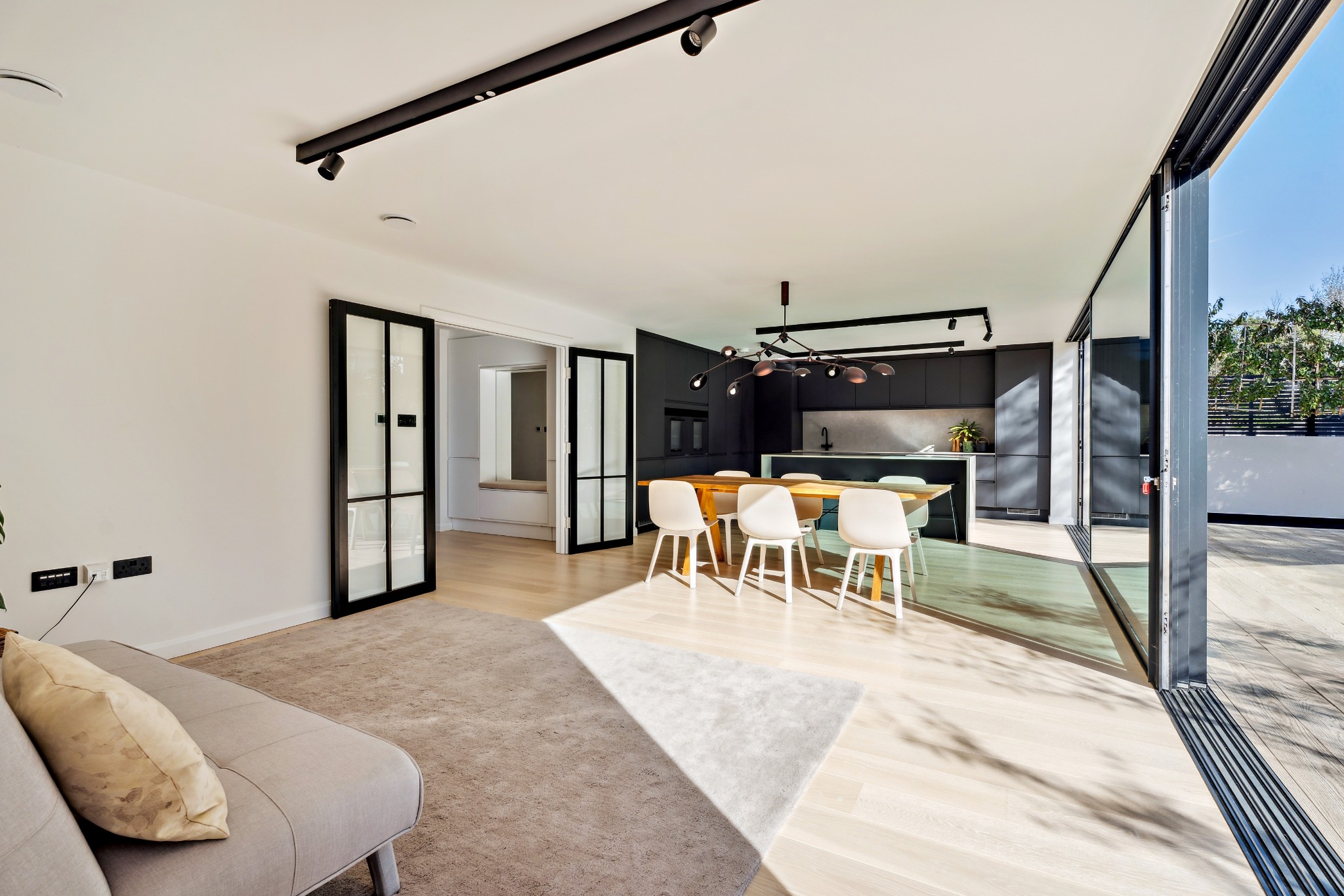 The ground floor is designed with an open-plan high end kitchen, dining, and living area, creating a bright and airy space for family gatherings and entertaining. 10 metre Maxlight sliding doors open seamlessly onto the private rear garden, allowing natural light to flood the space. The ground floor also features a living room, a dedicated study/gym, pantry/utility room and a downstairs W/C.