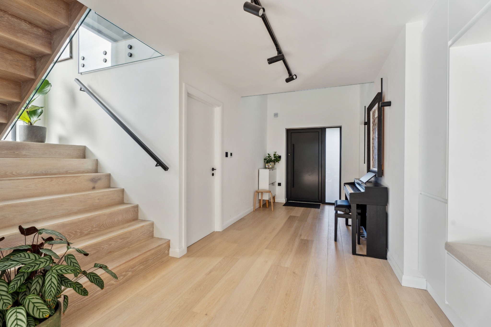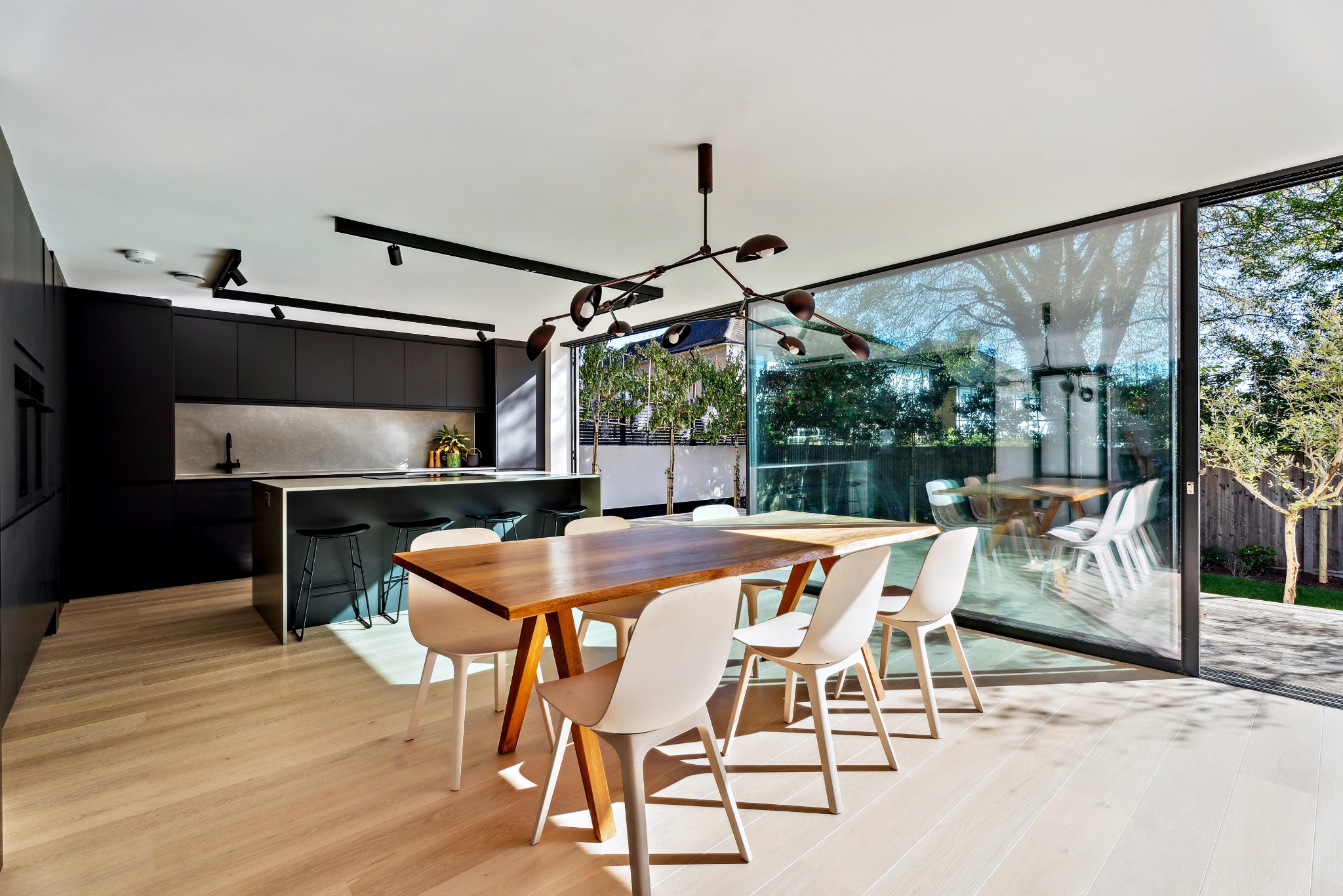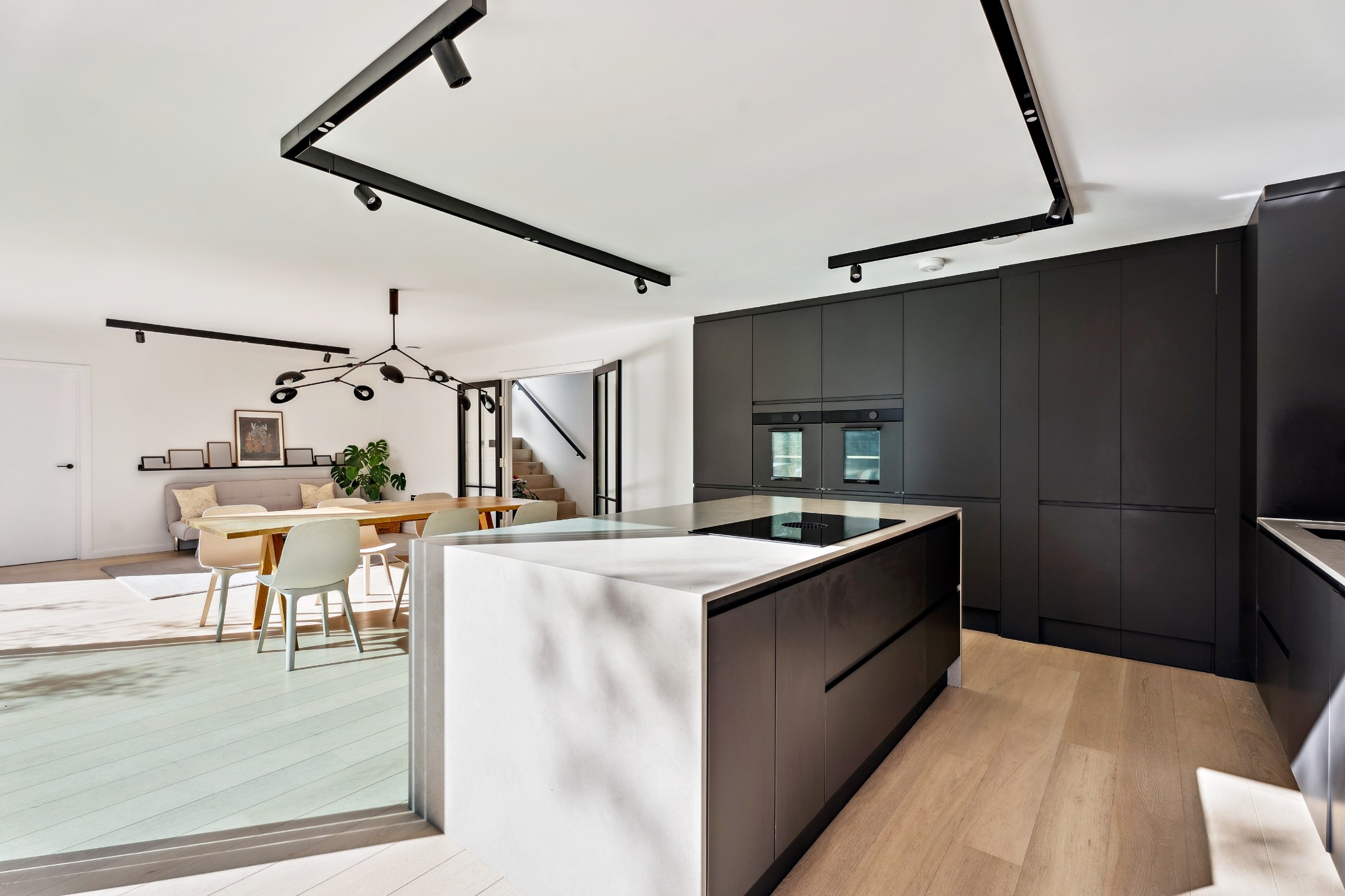 The ground floor is designed with an open-plan high end kitchen, dining, and living area, creating a bright and airy space for family gatherings and entertaining. 10 metre Maxlight sliding doors open seamlessly onto the private rear garden, allowing natural light to flood the space. The ground floor also features a living room, a dedicated study/gym, pantry/utility room and a downstairs W/C.