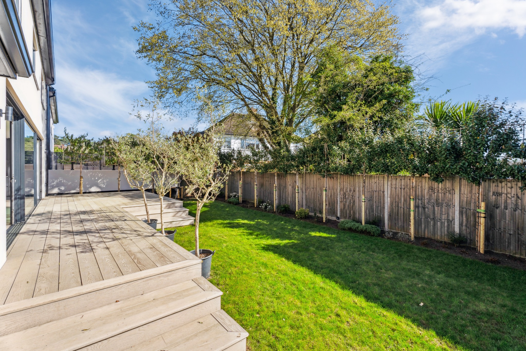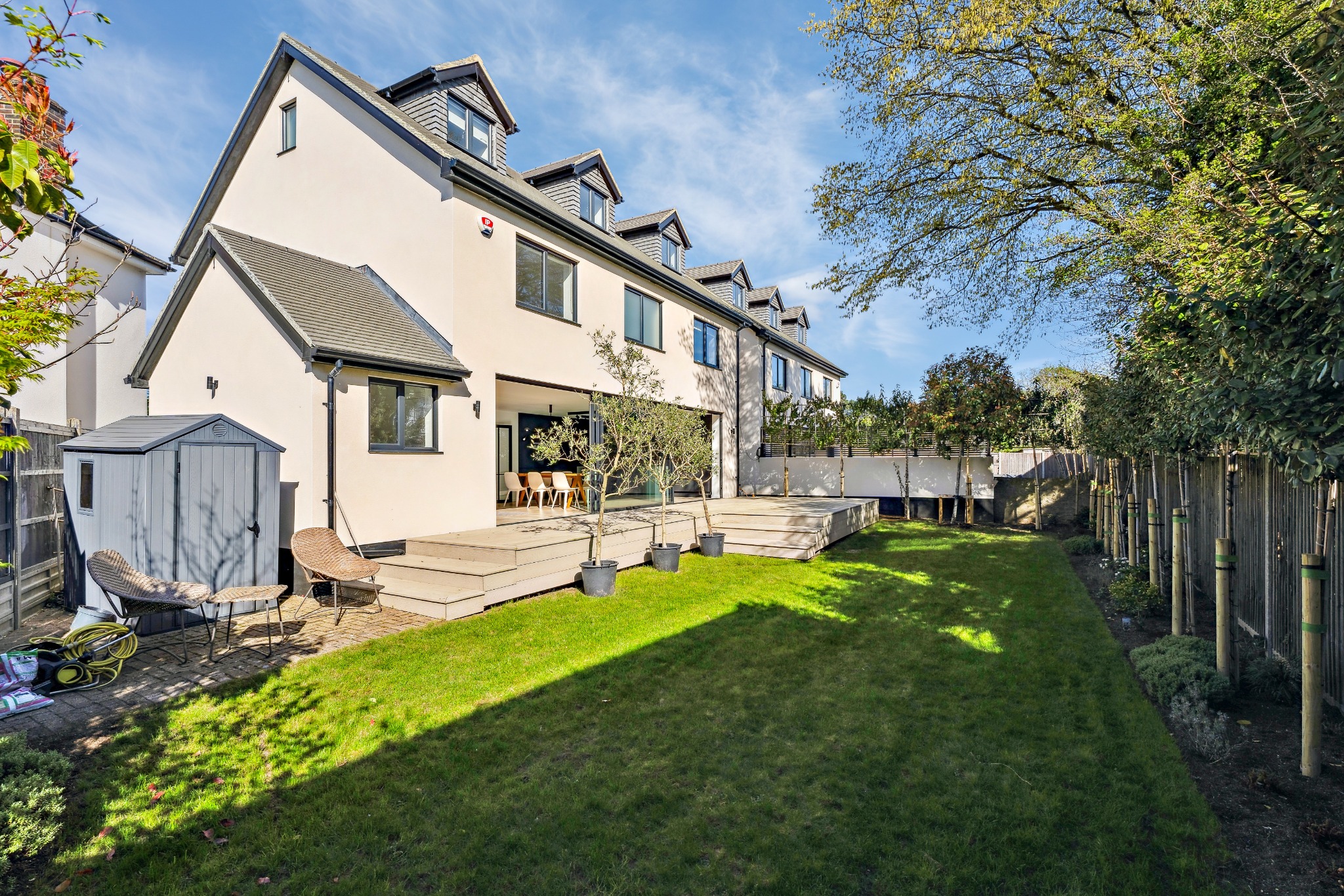 To the rear of the property, the private garden features a raised millboard decking area, perfect for outdoor dining or relaxation, with steps leading down to the lawn. To the front, driveway parking provides convenient off-road space for multiple vehicles and an electric car charging point.