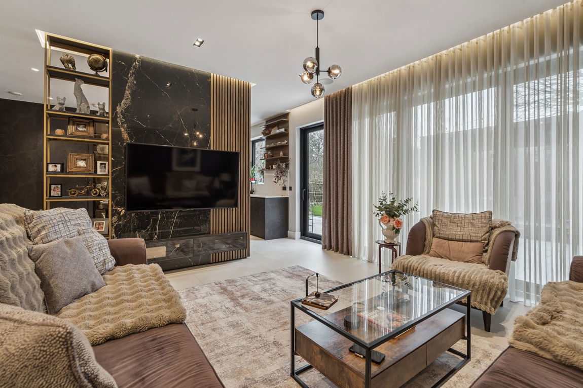 The ground floor comprises an entrance hallway with a guest WC, a superb kitchen / dining / living room with bi-folds opening out to the garden, and a TV room. The kitchen features bespoke units providing ample storage space, with a selection of glass front display units, as well as integrated appliances and an induction hob. In addition, a 'hidden' door gives access to a separate and well-equipped utility room. Completing the ground floor is a double bedroom with an en-suite shower room.