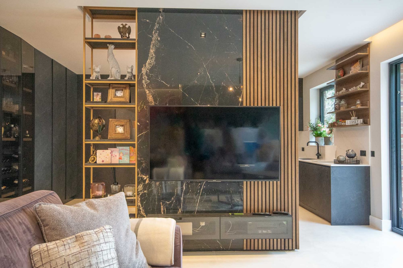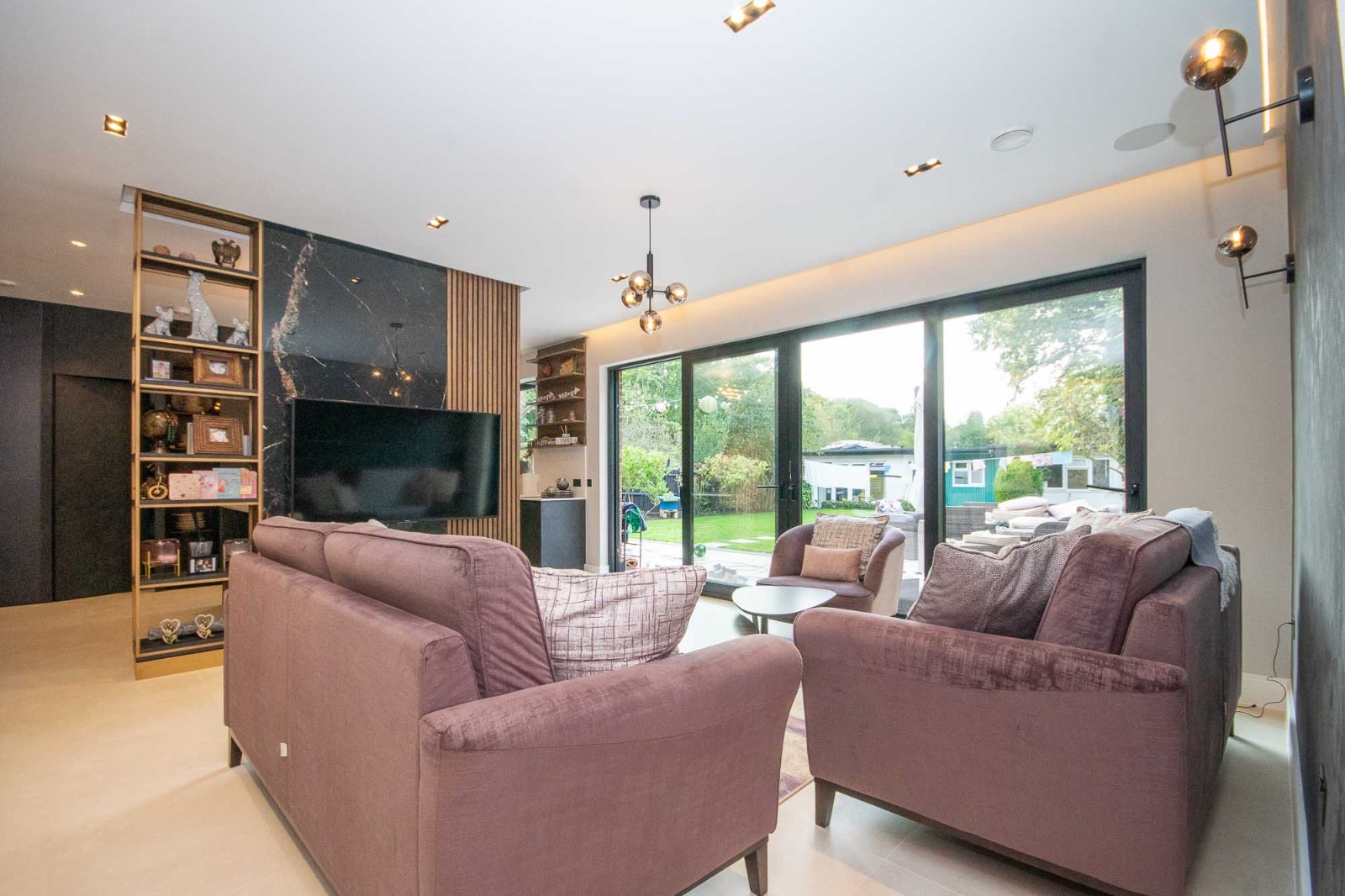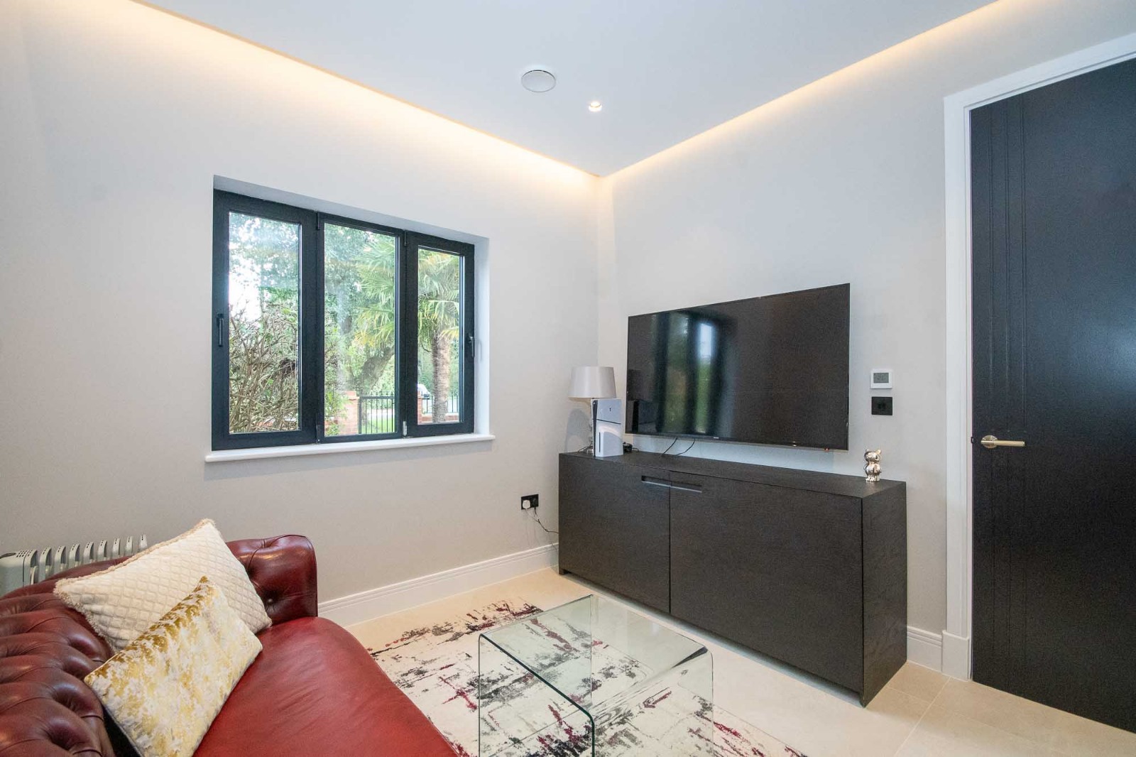 The ground floor comprises an entrance hallway with a guest WC, a superb kitchen / dining / living room with bi-folds opening out to the garden, and a TV room. The kitchen features bespoke units providing ample storage space, with a selection of glass front display units, as well as integrated appliances and an induction hob. In addition, a 'hidden' door gives access to a separate and well-equipped utility room. Completing the ground floor is a double bedroom with an en-suite shower room.