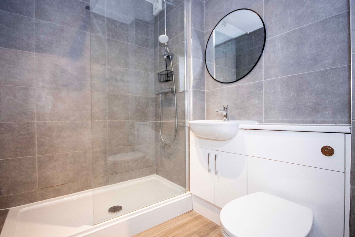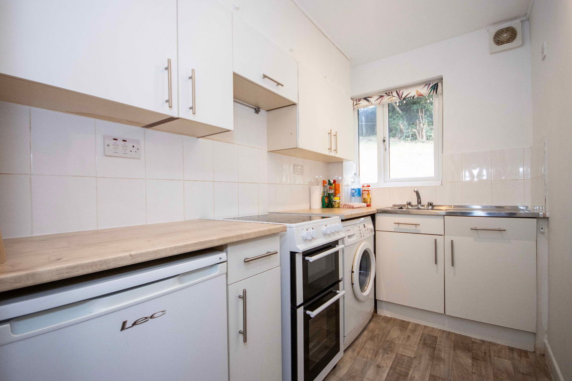 The accommodation comprises a generous 21'4 x 11'8 front-aspect living/dining room, filled with natural light and complete with a large built-in storage cupboard. Off the living room, a hallway leads to a well-appointed kitchen, offering a range of fitted units and space for freestanding appliances. The double bedroom benefits from fitted wardrobes, and the fully tiled bathroom features a shower and under-sink storage.