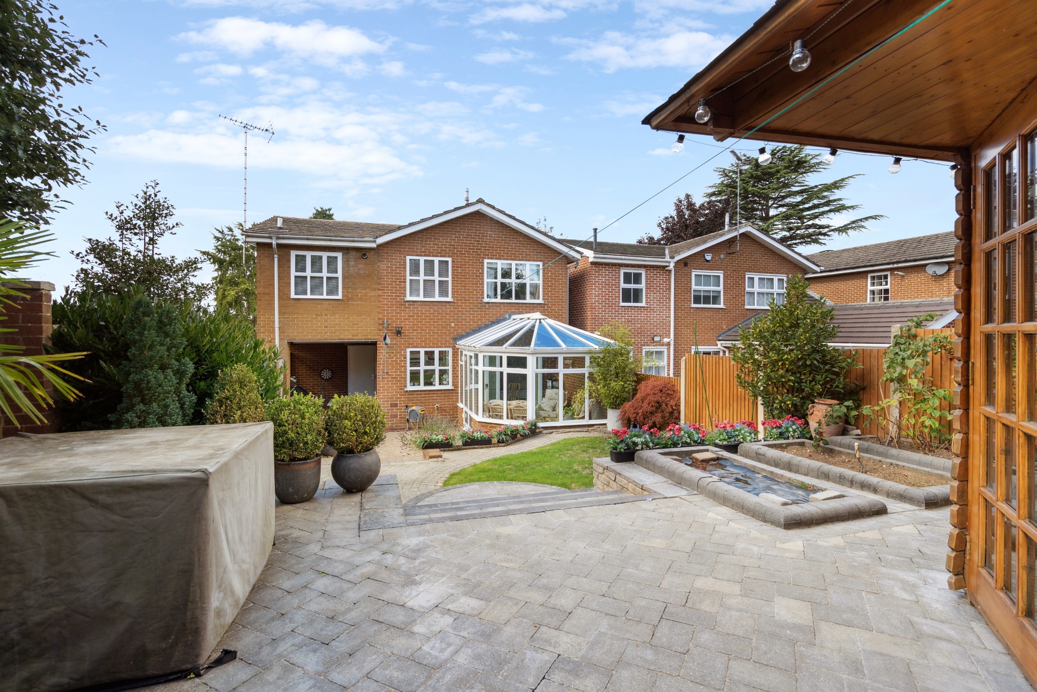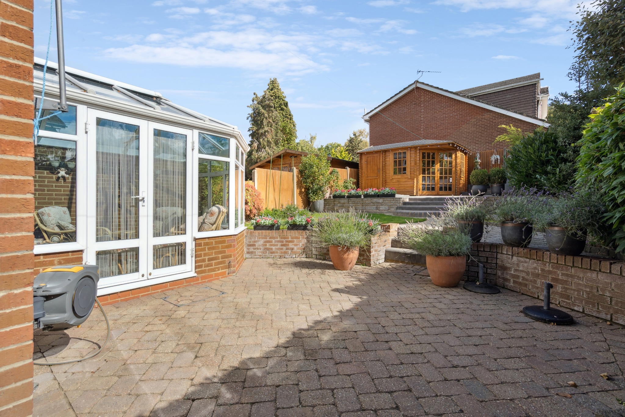 Externally, the rear garden is attractively designed, predominantly block-paved with a small lawn area, mature shrubs, and hedging. Steps lead to a delightful summer house, ideal for use as a home office, playroom, or hobby space, complete with its own terrace area. To the front, a driveway provides off-street parking in addition to the integral garage.