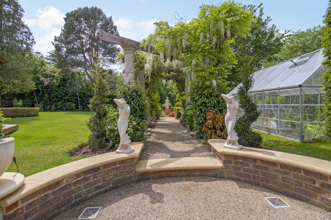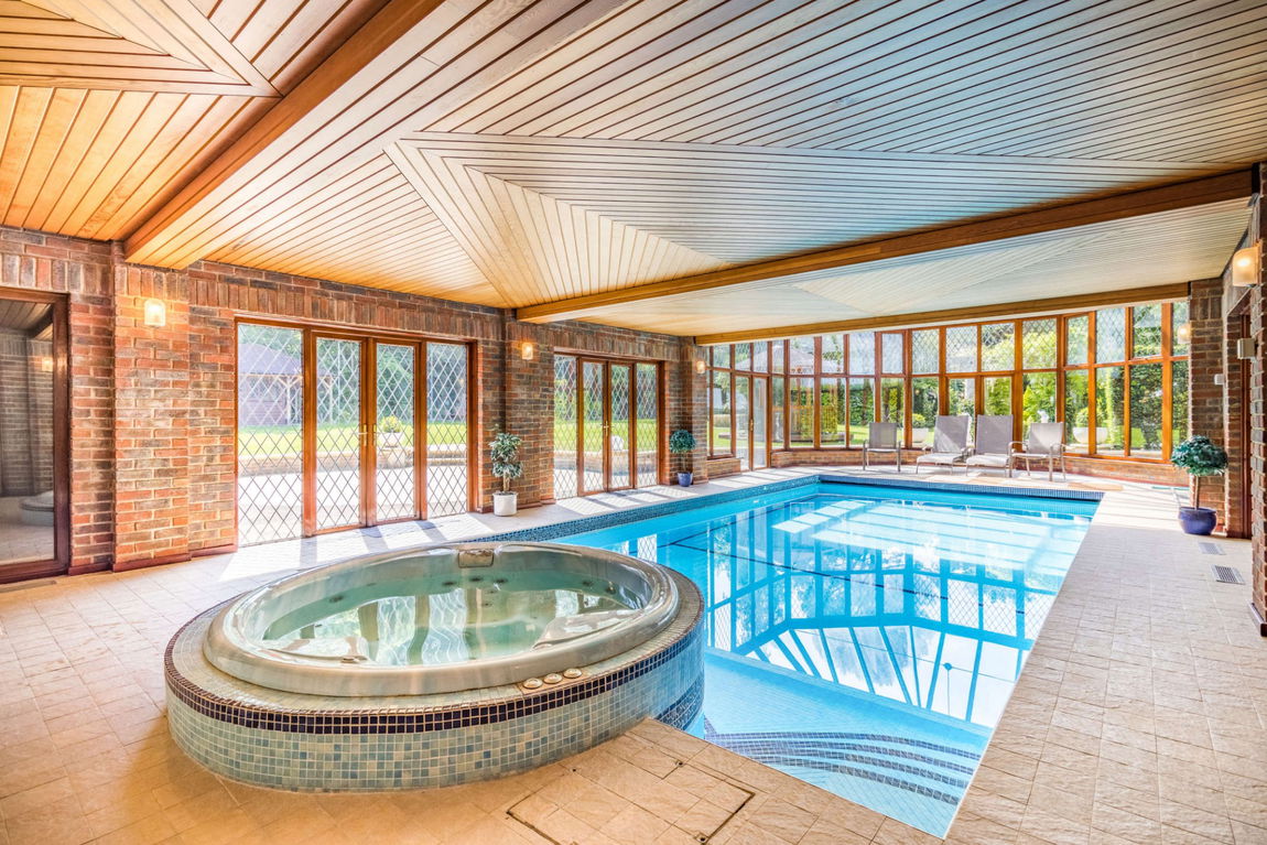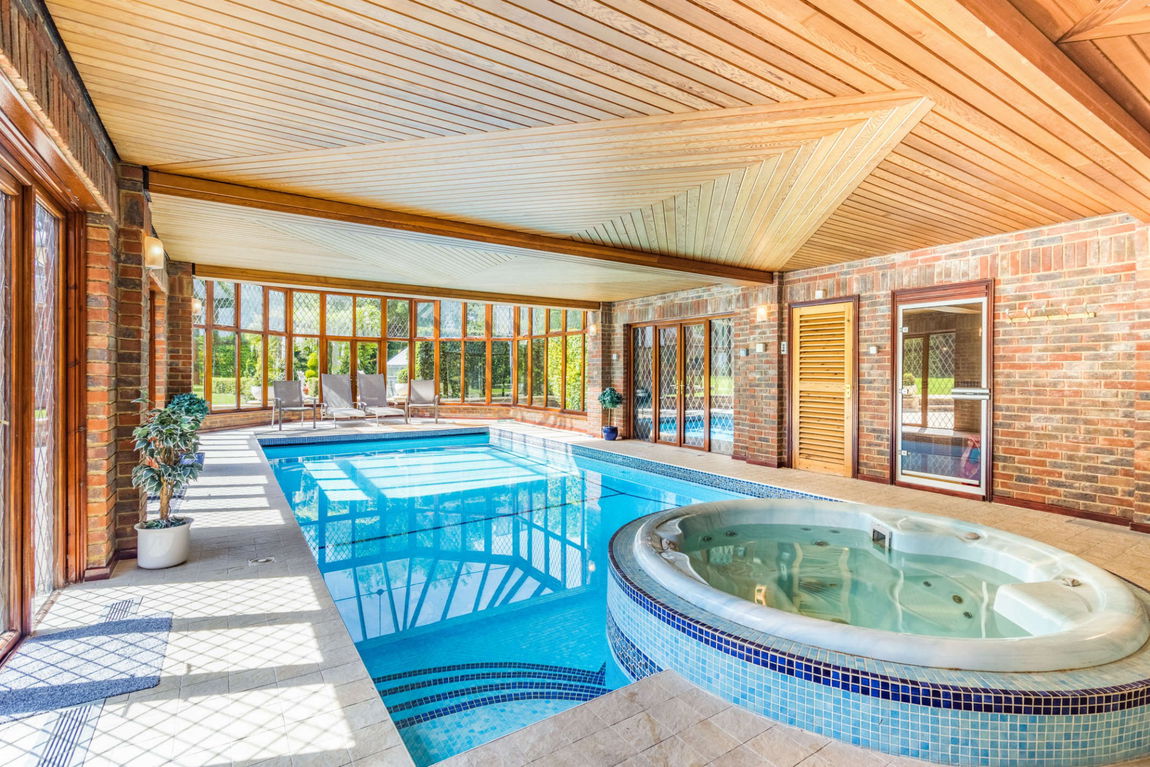 A gated detached house set in mature landscaped grounds approaching 1.5 acres, with 4/5 reception rooms, 8 bedrooms and 7 bathrooms. The property is presented in excellent decorative order throughout, to the ground floor are four spacious reception rooms offering flexible family accommodation, a kitchen/breakfast room, separate utility room, cloakroom and access to the pool complex.  The eight bedrooms and seven bathrooms are arranged over two floors. At the rear of the property is a beautiful landscaped garden with various features of flowers and shrubs, a Pagoda, summer house and a patio area for outside entertaining. The property has a gated carriage driveway with parking and access to the double garage.